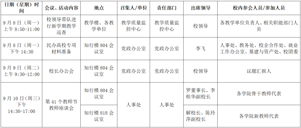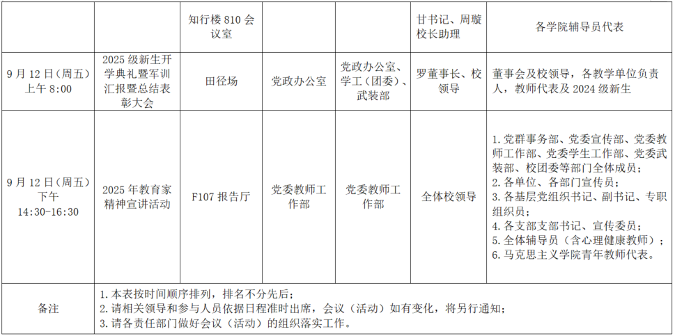 2025年秋季学期第二周(9月8日-9月14日)全校性会议活动安排表