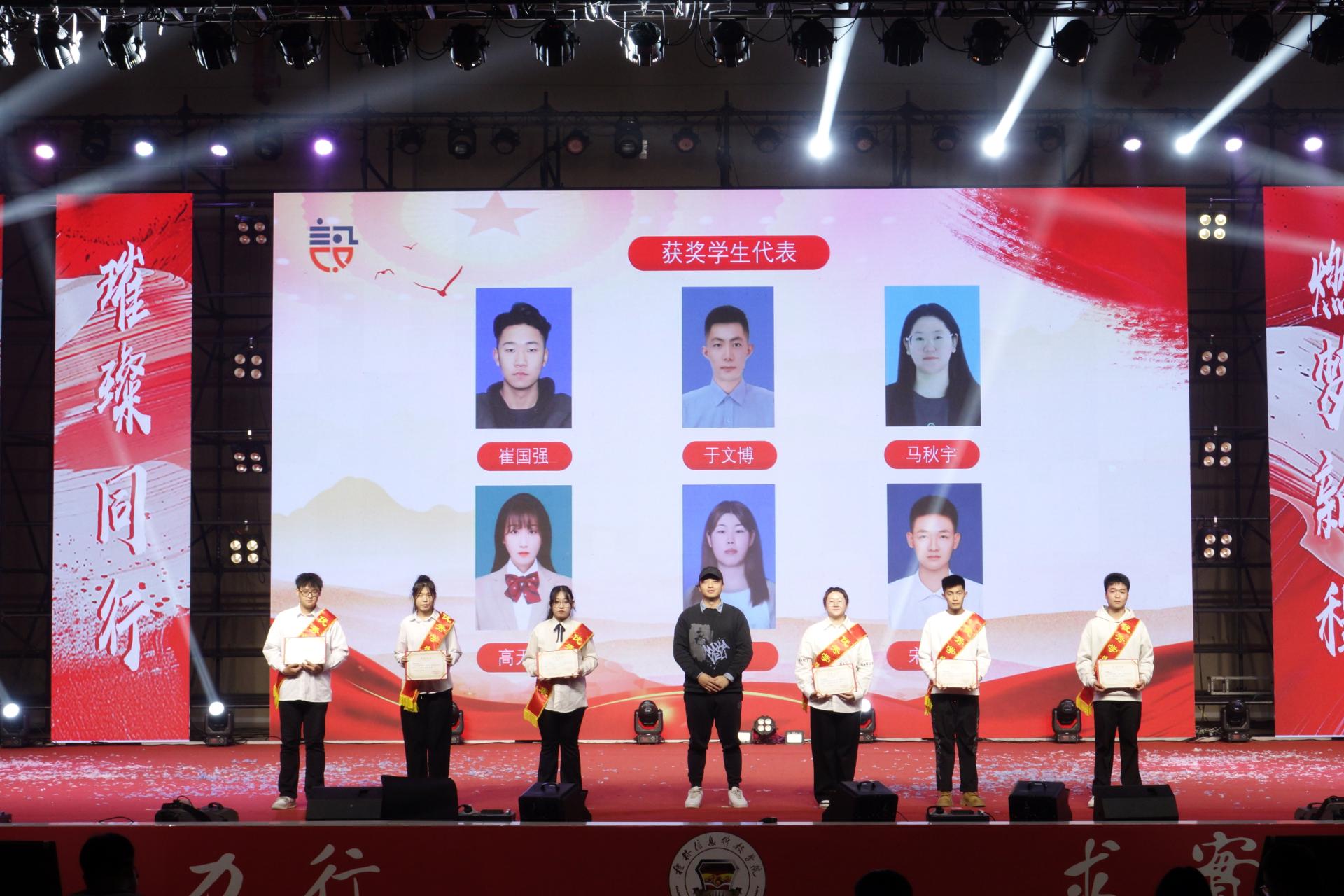晚会节目璀璨夺目,不仅展现了青年人的活力四溢与朝气蓬勃,还体现了青年人的创新思维与独特视角,更深刻呈现了青年人的团结协作精神与不懈追求。表彰环节对获得各类奖学金、优秀共产党员、优秀共青团员及团干、美育及体育优秀个人、优秀志愿者等荣誉的学生代表进行了表彰,以此肯定他们的辛勤付出和卓越成就,激发全体学生向这些优秀学生代表看齐。
