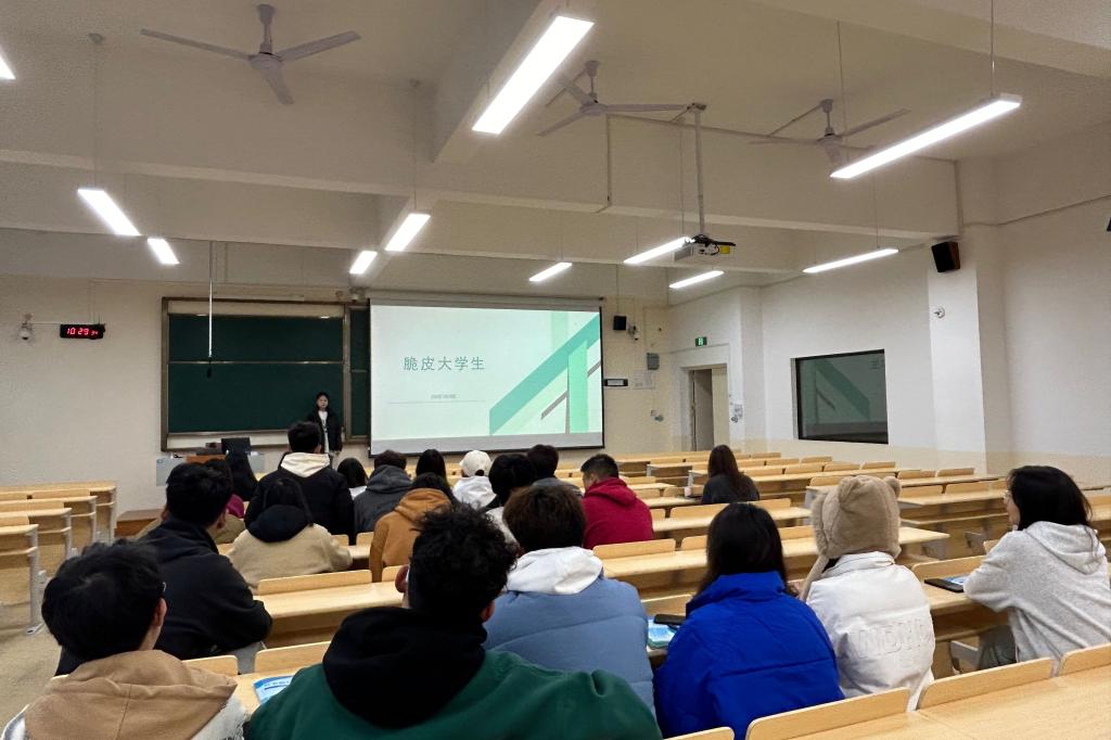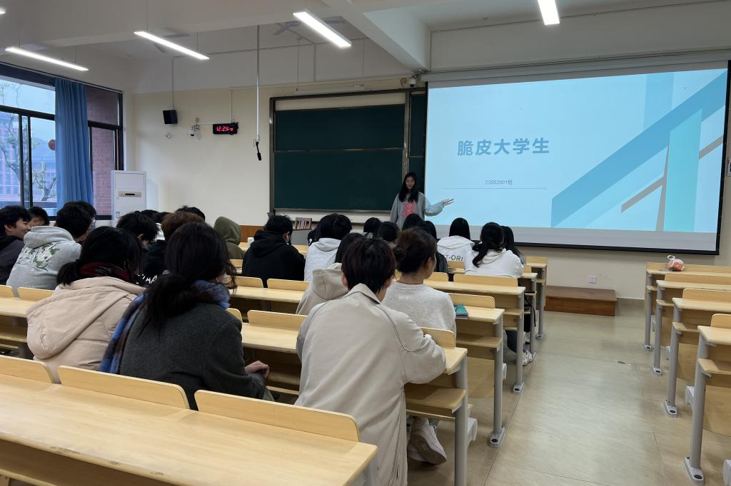会上,各班心理委员通过介绍“脆皮大学生”的定义,列举大学生群体中频发的“脆皮”事例,让同学们了解定期休息和放松是维持心理健康的关键,与人沟通是促进心理健康的重要途径。