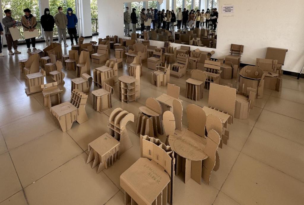 近日,创意设计学院在四教二区平台处举办了《课程设计Ⅱ》与《机械及产品结构设计》的课程作业汇报展。学院2020级产品设计专业的同学在苏锐和严若瑾老师的指导下完成了瓦楞纸可拆装坐具的设计。展出座椅四十余件原创设计作品。