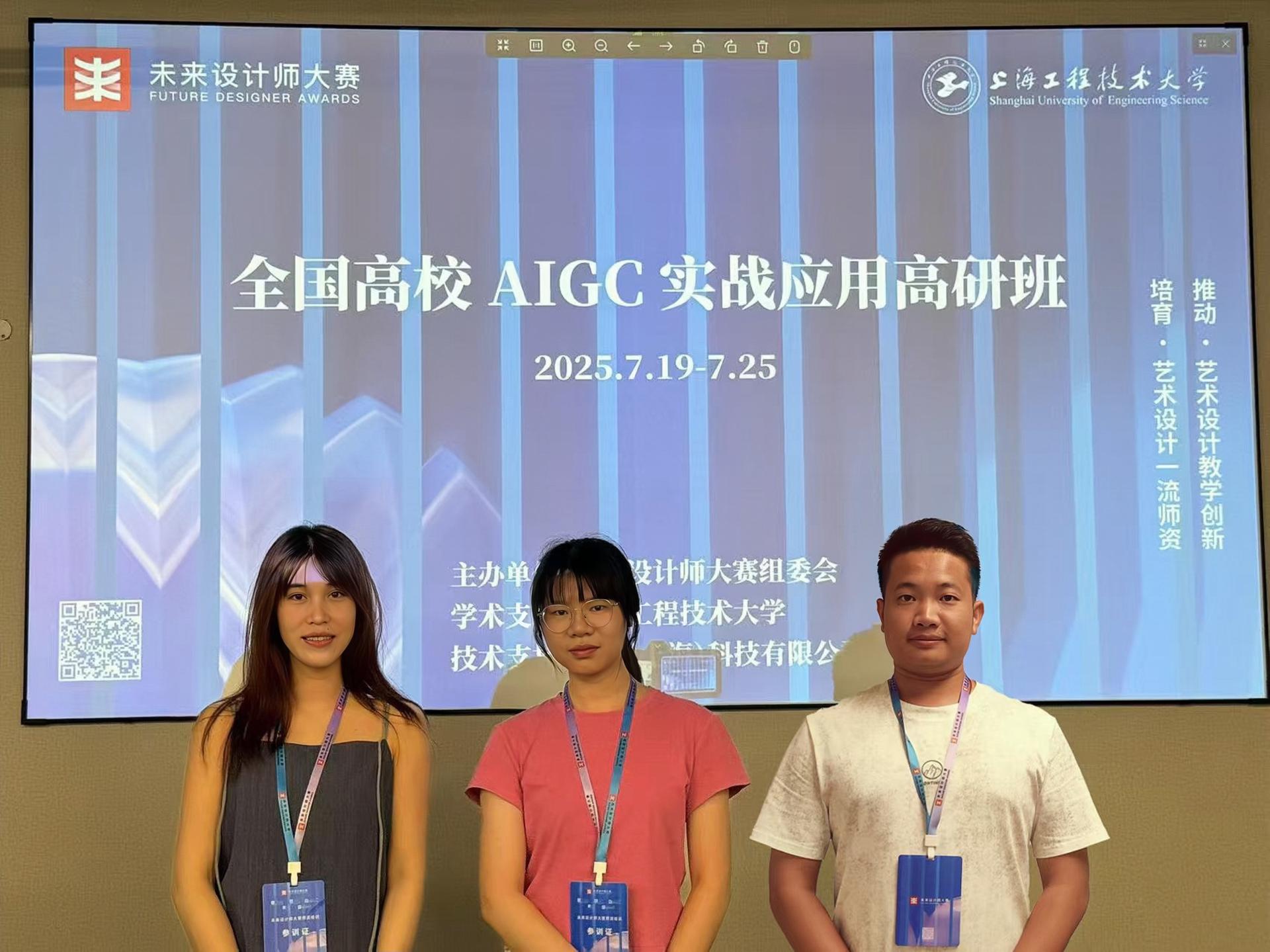 2025年7月19日至25日,创意设计学院动画、虚拟现实技术教研室的韦红毅、粟宁团、胡勇文三位老师参加了由未来设计师大赛组委会在上海工程技术大学举办的全国高校AIGC实战应用高研班(上海站)的培训。此次培训旨在助力高校教师提升AIGC实战技能,增强竞赛指导能力,进而推动教学创新。