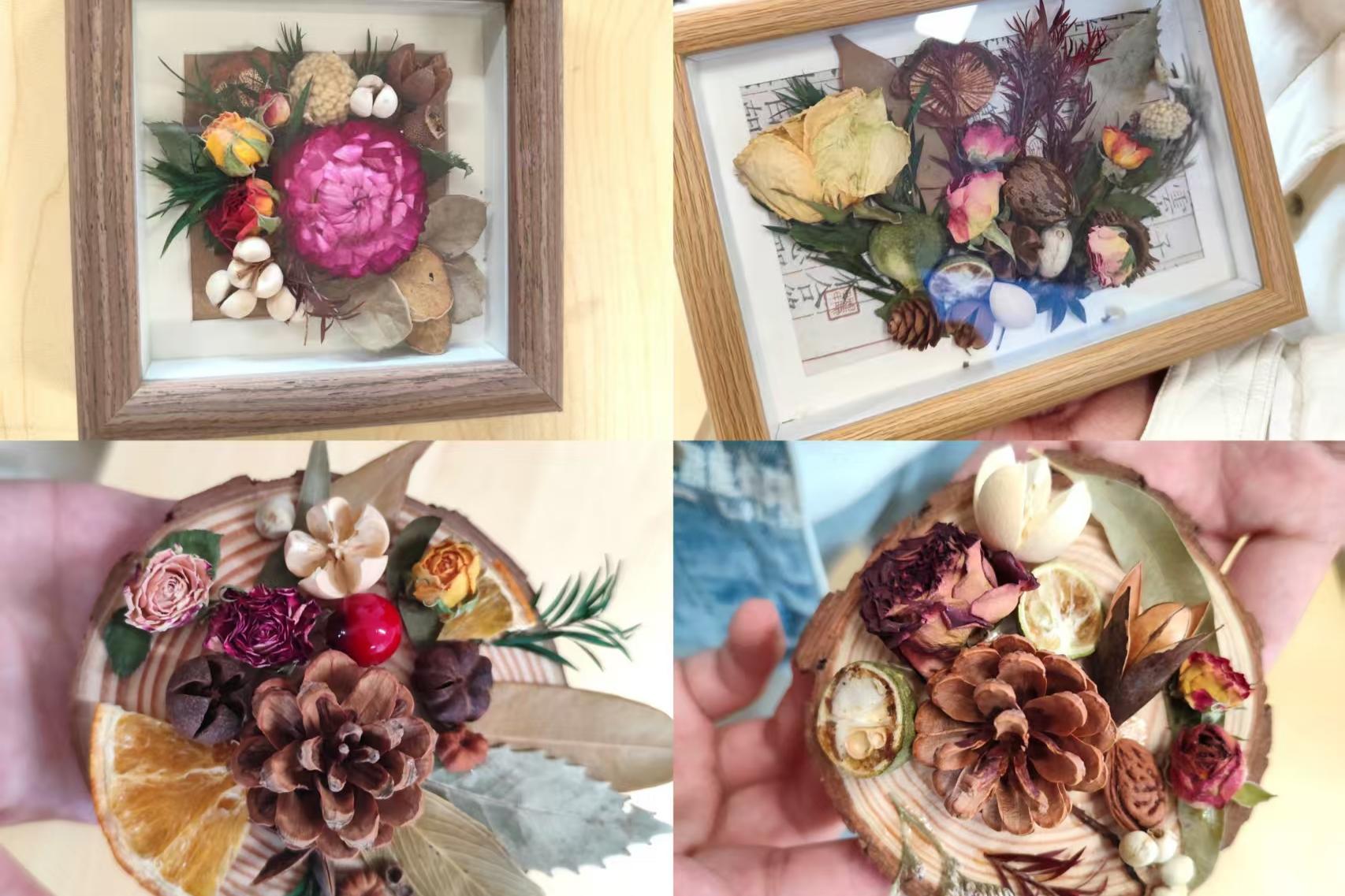 李奕老师首先向同学们介绍本次活动可创作的作品类型,分享不同果实素材的搭配技巧。随后,她着重讲解了制作过程中的要点。同学们兴致高涨,纷纷挑选心仪的素材,在相框和圆木片上发挥想象,构思布局。有的以错落果实打造层次感,有的搭配彩叶点缀细节。从构思设计到粘贴固定、装饰收尾,每一步都专注投入。创作间隙,同学们还不时交流灵感,分享搭配巧思,一片片彩叶、一颗颗果实经过巧手组合,变成兼具实用性与观赏性的文创作品。