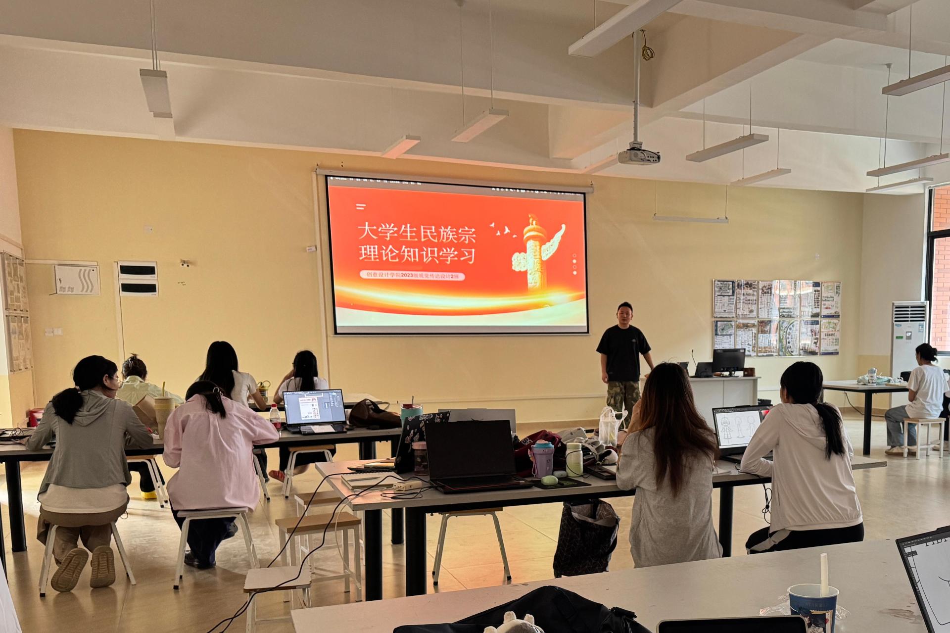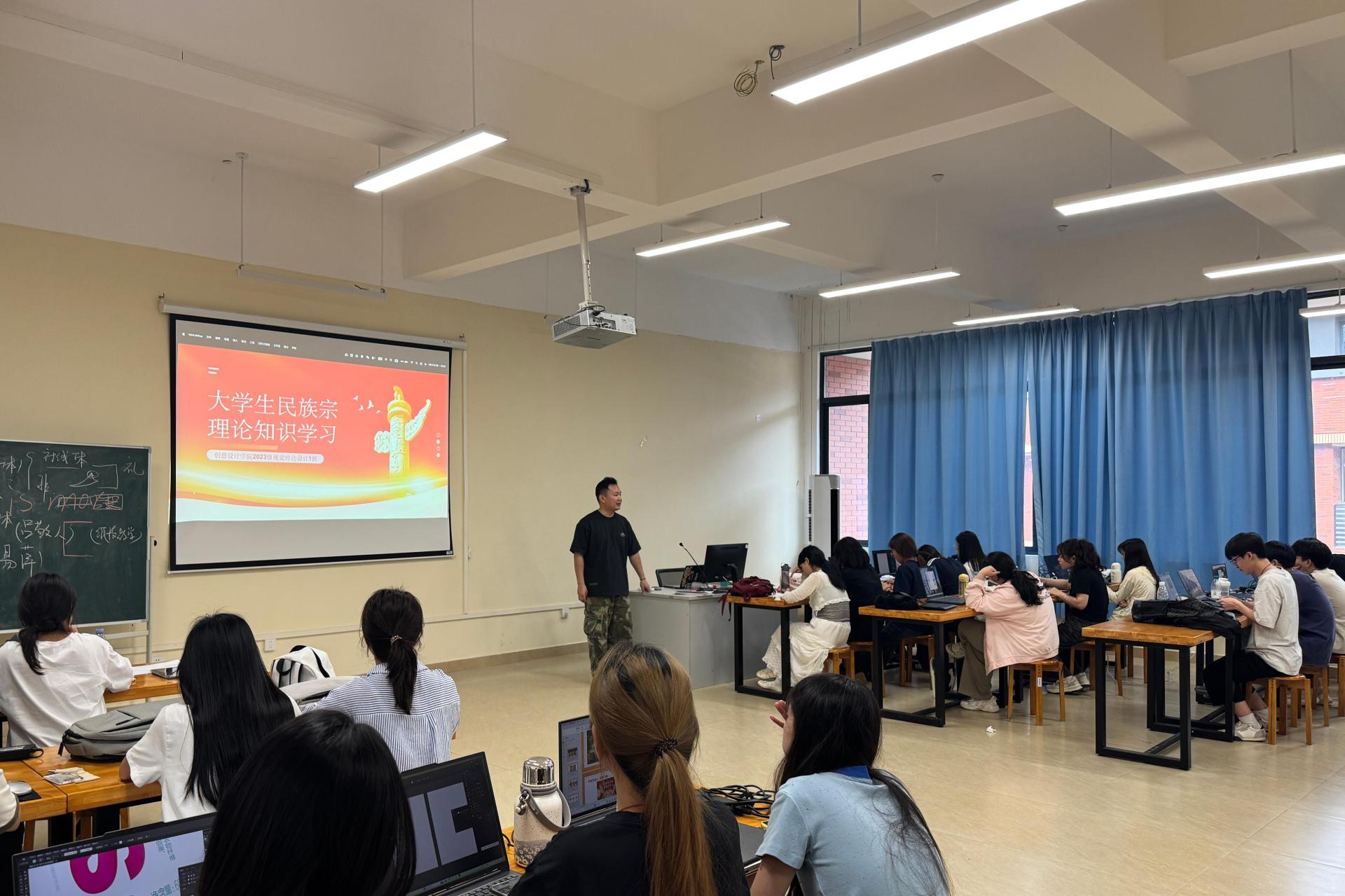 为提升大学生对民族宗教理论知识的认知水平,树立正确的民族观与宗教观,4月21日至22日,2023级视觉传达设计1班和2班于德远楼开展“大学生民族宗教理论知识学习”班会。班会由蔡佳航老师主讲,全体学生参与。