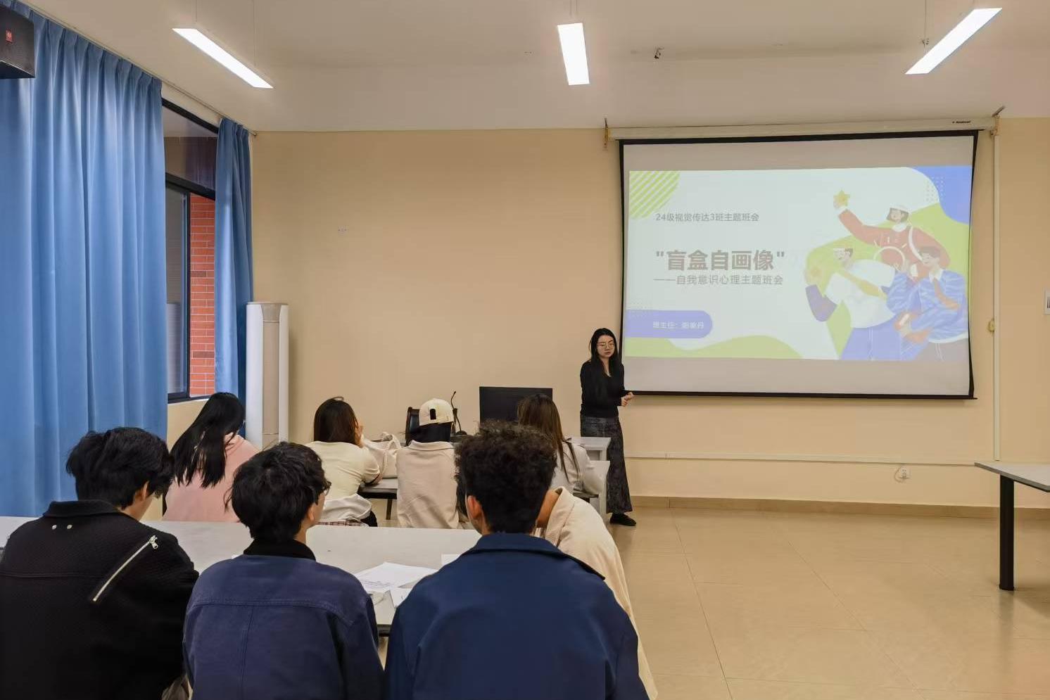 当今社会,自我意识培养已成为青少年成长过程中的一个重要议题。4月7日,2024级视觉传达设计3班在德远楼E401教室举办了一场关于自我意识的心理主题班会——“盲盒自画像”。会议由班主任阳单丹老师主持,旨在帮助学生深入理解自我意识的定义、重要性以及如何培养和应用自我意识。