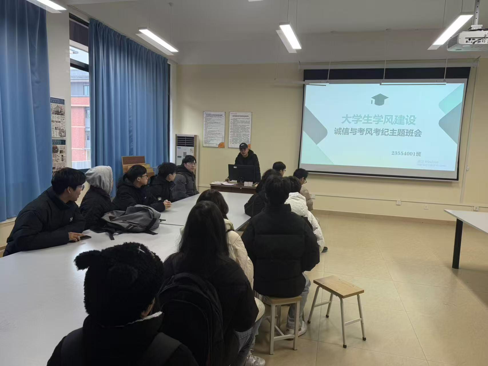 12月13日,在期末考试临近之际,为了进一步加强大学生诚信教育,营造良好的考试氛围,创意设计学院环境设计23554001班在德远楼E312教室开展以“诚信考试学风建设”为主题的班会活动。此次班会旨在引导学生树立正确的考试观念,弘扬诚实守信的传统美德,共同维护学院的学术诚信与优良学风。班会由班主任蒙敏老师主持,全班同学积极参与,现场气氛热烈而庄重。