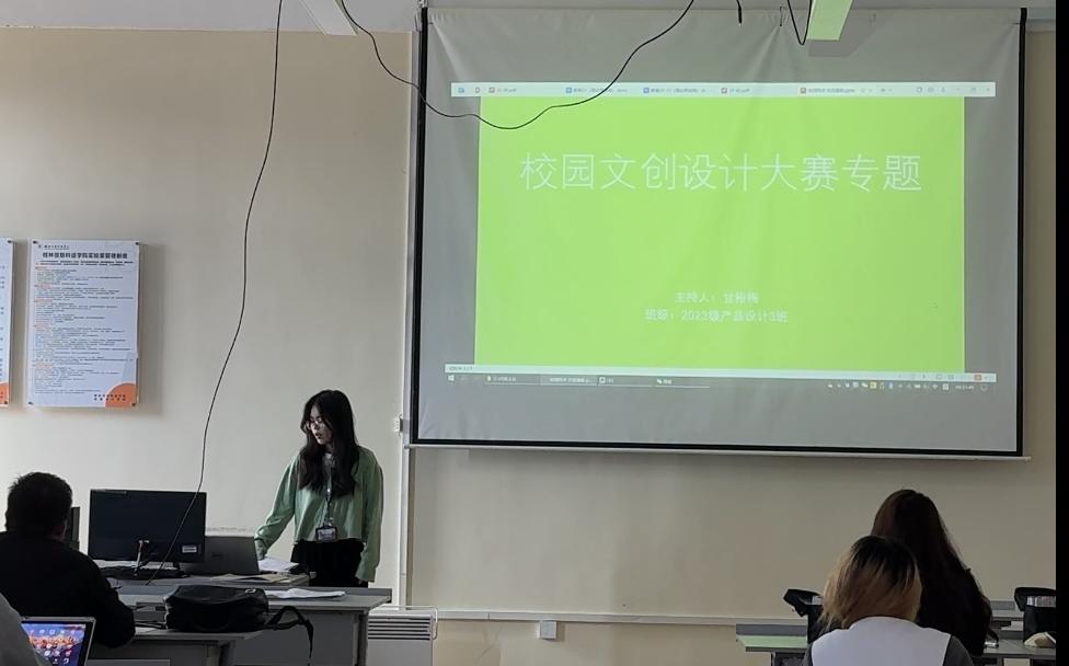班会上,甘老师详细介绍了即将举行的校园文创主题竞赛的背景、目的及参赛要求。她指出,此次竞赛旨在激发学生的创新思维,提升学生的设计实践能力,并鼓励同学们结合校园文化特色,设计出具有创意和实用价值的文创产品。