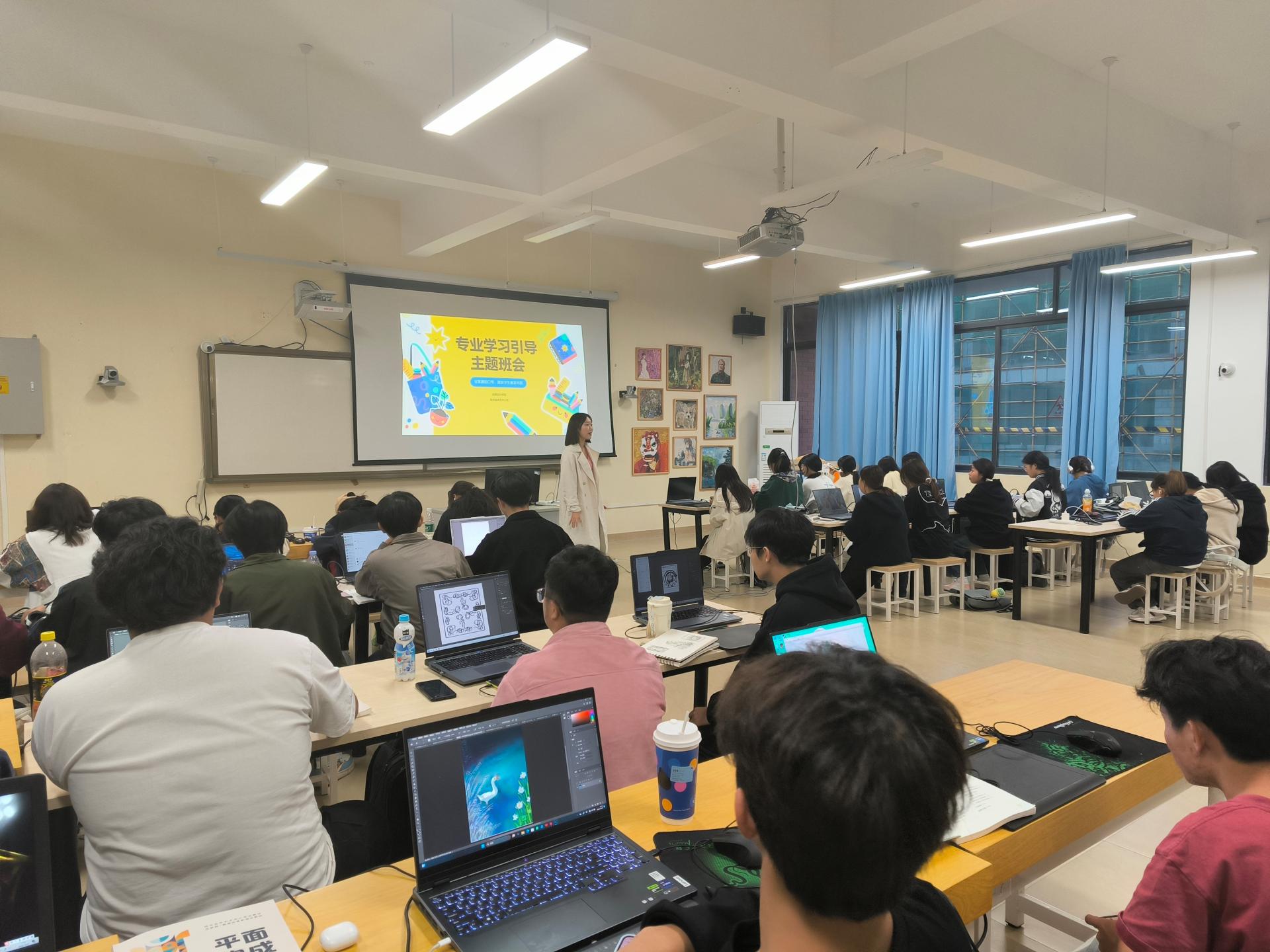 接着,张老师详细介绍了数字媒体艺术专业的课程设置和教学计划。从基础课程到专业核心课程,张老师逐一进行了说明,并特别强调了实践教学的重要性。“我们的课程不仅注重理论知识的传授,更强调实际操作能力的培养。希望大家能够充分利用实验室和工作室资源,多动手、多实践,提升自己的专业技能。”张老师的讲解让同学们对未来的课程安排有了清晰的了解,增强了学习的动力。