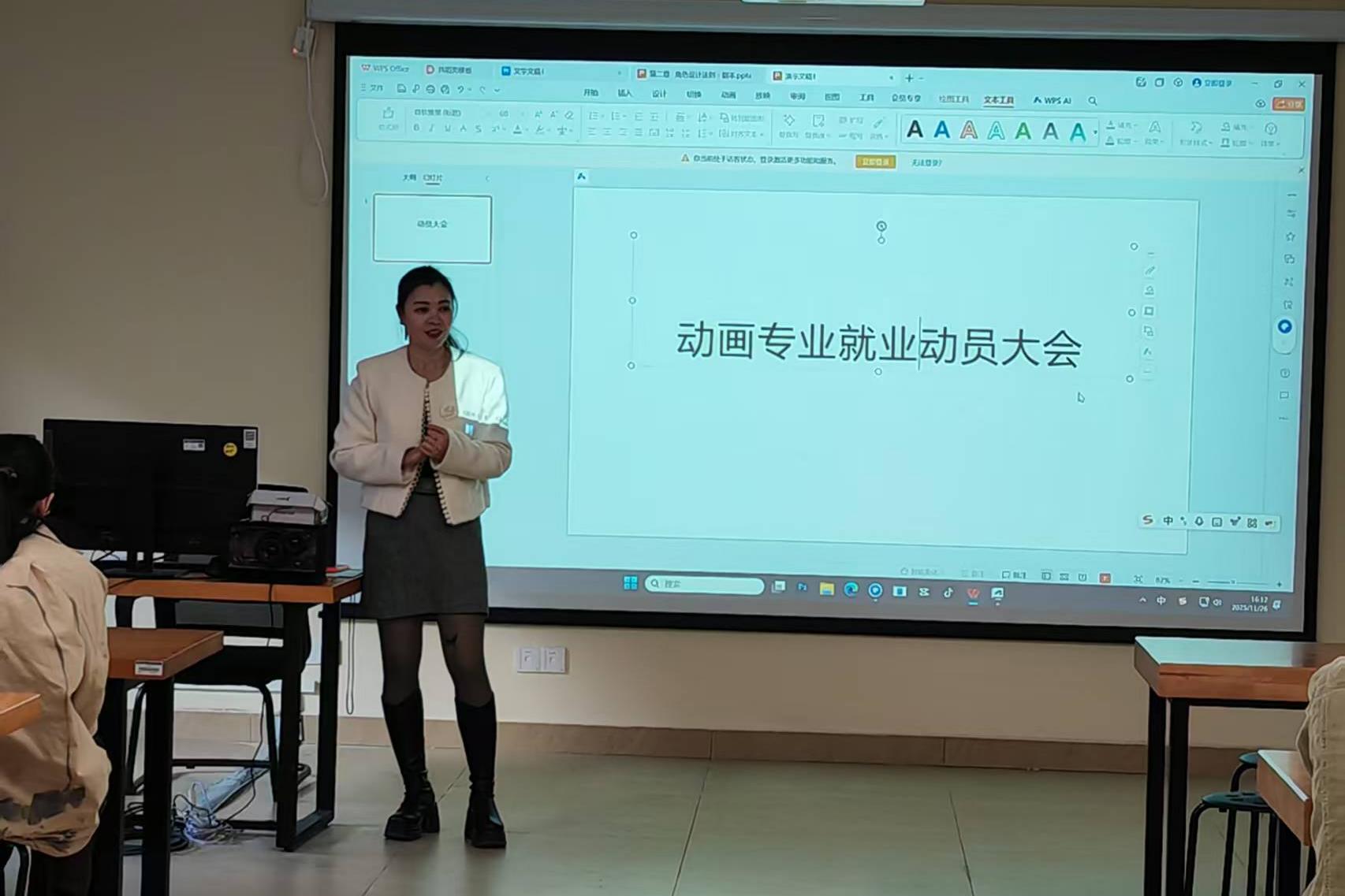 12月22日,动画专业于在守正楼G409教室成功举办2026届毕业生就业动员大会。本次大会由动画教研室主任伍菲老师主持,旨在帮助毕业生明确就业方向、增强就业意识,为即将到来的求职季做好充分准备。