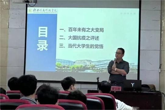 黄云鹏书记主要围绕世界百年未有之大变局、大国抗疫之评述、当代大学生的觉悟三块内容进行讲课。课上,黄书记首先引经据典,向同学们介绍什么是“百年未有之大变局”;然后,黄书记对比中国与某些西方国家在防疫抗疫上采取的不同态度、措施及取得的不同成果,让同学们深刻感受到始国家终坚持人民至上、生命至上的初衷;最后,黄书记以校训“博文约礼、敬事益谦”勉励同学们博学以文,约之以礼,敬事慎行,谦逊有礼,要不断提升自身知识技能、学习能力、综合素质、敬业精神。