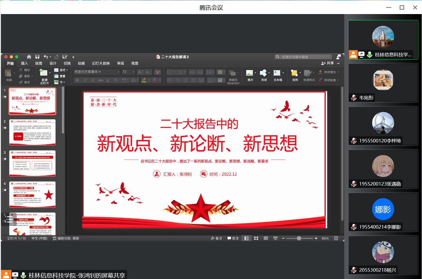 12月13日,创意设计学院第二学生党支部在42406党员活动室开展线上线下《二十大报告中的新观点、新论断、新思想》专题党课。支部书记张鸿钊主讲,全体党员参加。