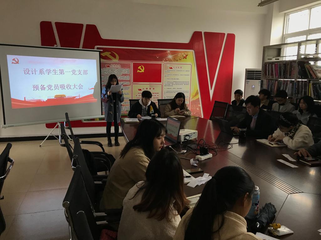 11月23日,设计系第一、第二学生党支部在42406党员活动室召开预备党员接收大会,分别由设计系第一学生党支部书记刘思、第二学生党支部书记张鸿钊主持。