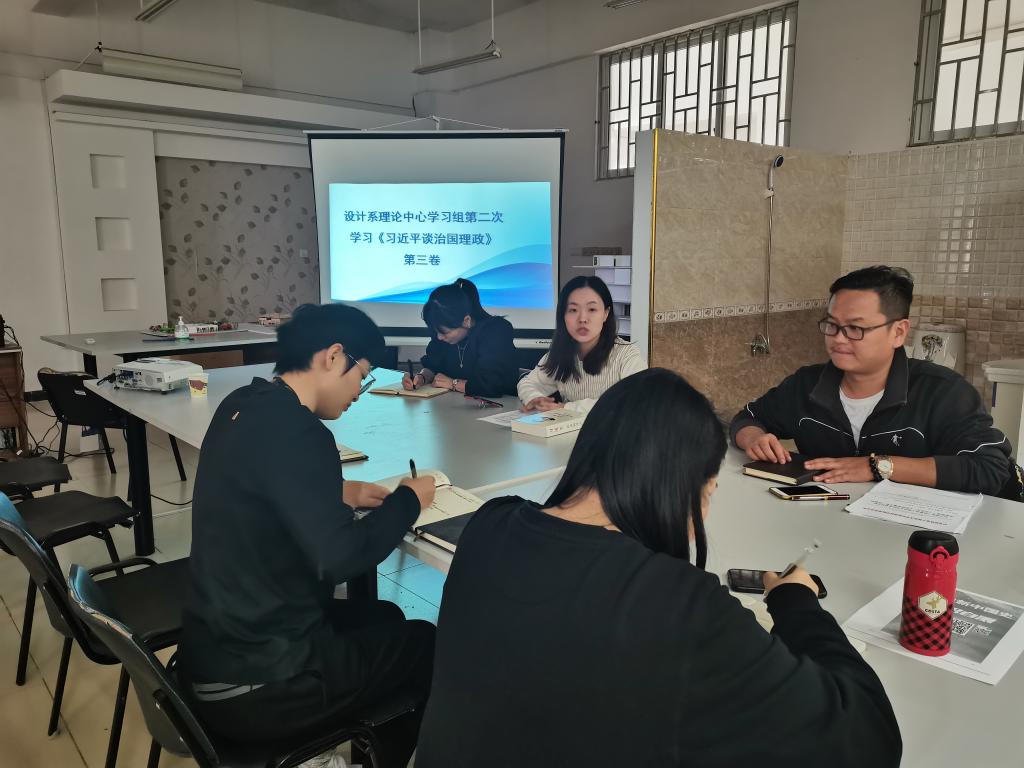 10月16日,设计系党总支支委田婧在42201教室主持开展第二次《习近平谈治国理政》第三卷专题学习会,设计系理论学习中心组全体成员参会。