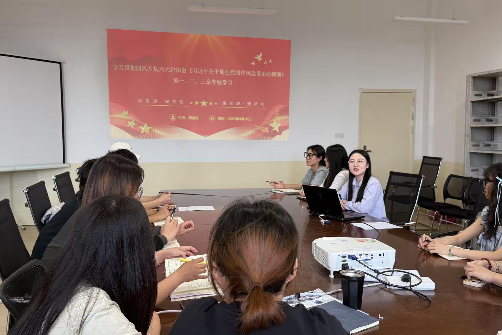 为强化党员们的纪律意识,筑牢思想防线,推动全面从严治党在基层党支部走深走实,2025年4月28日,创意设计学院第一党支部在德远楼E504召开学习贯彻四风八规六大纪律暨《习近平关于加强党的作风建设论述摘编》第一、二、三章专题学习会。会议由第一学生党支部书记周金悦主持,支部全体党员参会。