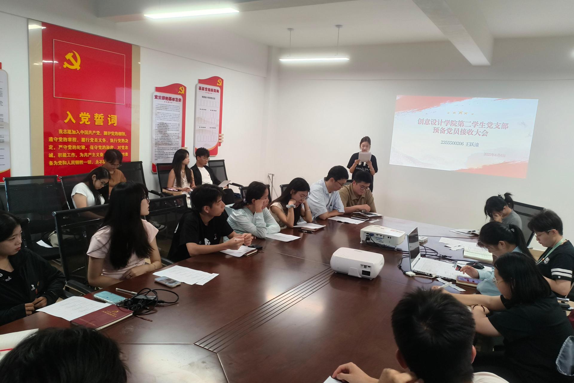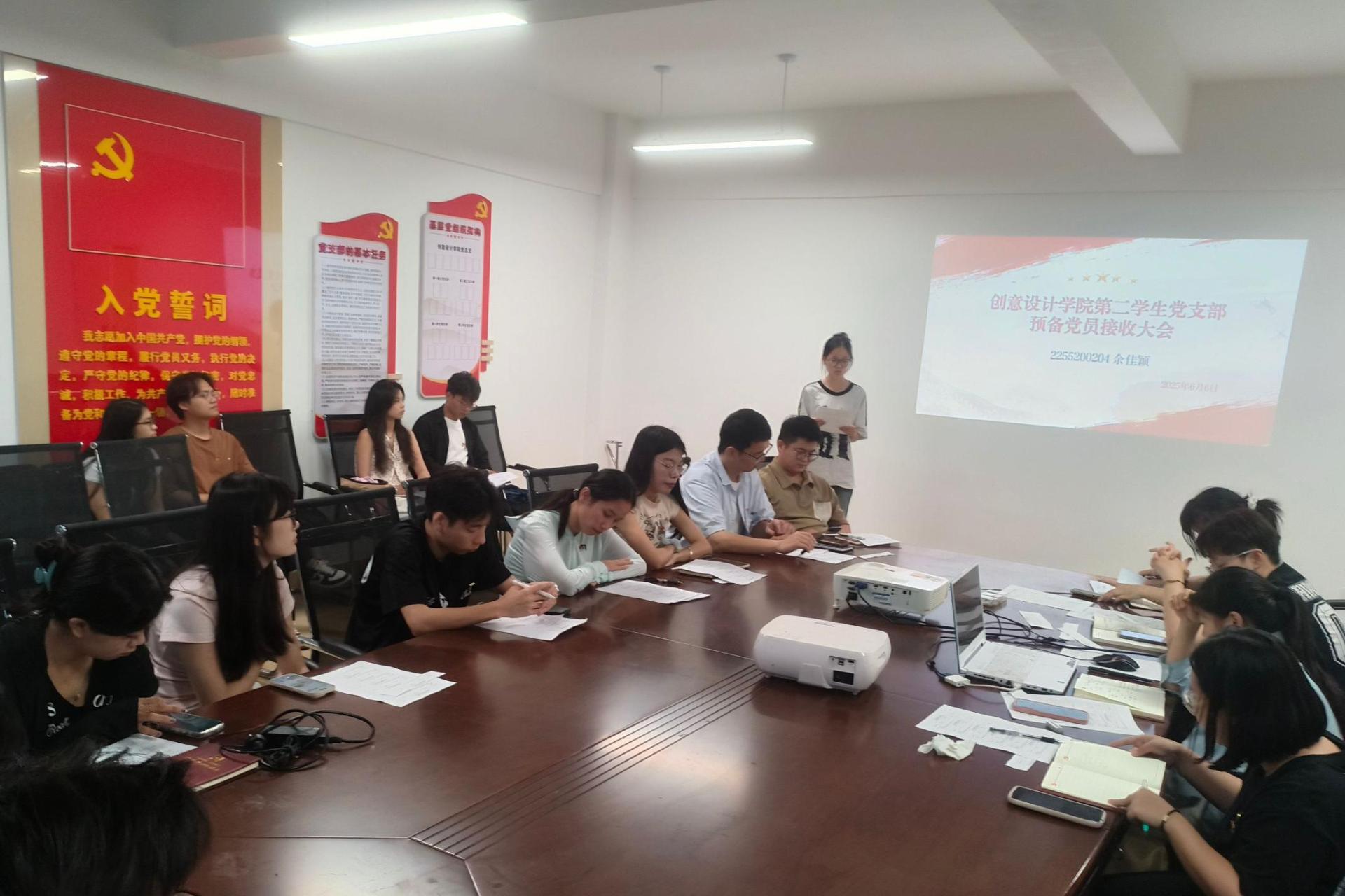 6月6日,创意设计学院第二学生党支部于守正楼G517召开预备党员接收大会,讨论是否接收余佳颖、王跃潼、李春洁、王诺琦、唐雨彤、方紫星、张雨萌6名同志为预备党员的问题。大会由刘思志同志主持,全体党员参与。