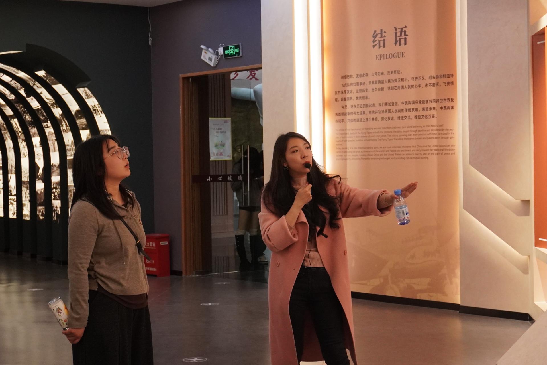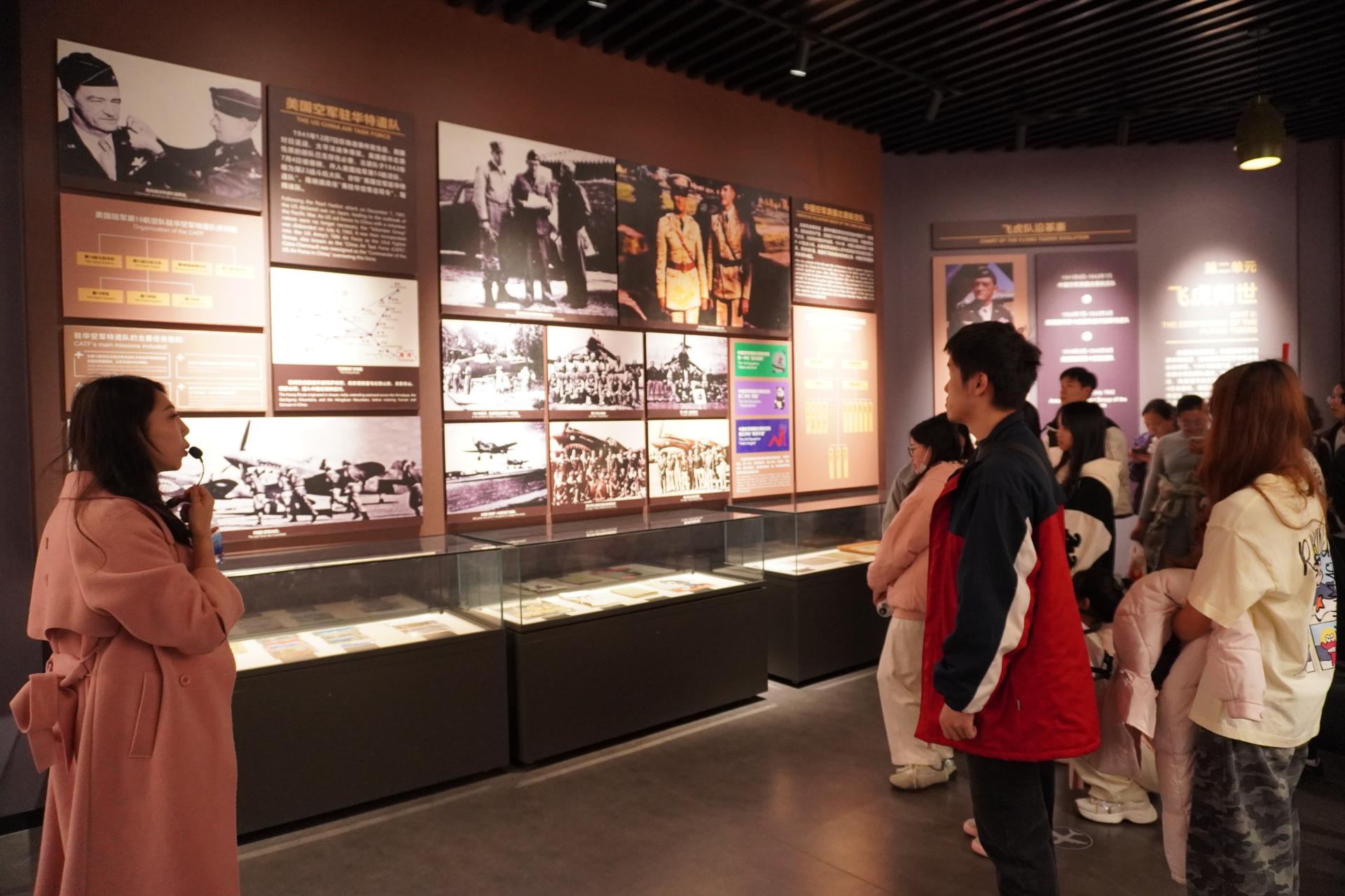 活动上,纪念馆讲解员以“飞虎队援华抗战”为主线,结合珍贵的历史照片、实物展品与场景复原,生动再现了二战时期美国志愿航空队(飞虎队)与中国军民并肩作战、保卫桂林领空的英勇事迹。从锈迹斑斑的战机残骸、泛黄的作战地图,到飞行员的飞行服与勋章,每一件展品都承载着厚重的历史记忆,让在场师生深刻感受到战争年代的艰辛与英雄们的无畏担当。