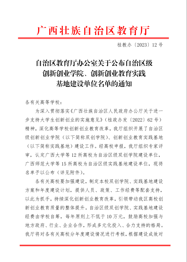 日前,根据广西壮族自治区教育厅《关于公布自治区级创新创业学院、创新创业教育实践基地建设单位名单的通知》(桂教办〔2023〕12号)文件,认定全区12所高校为自治区级双创学院建设单位,纽约国际官网成功入选自治区级创新创业学院建设单位。