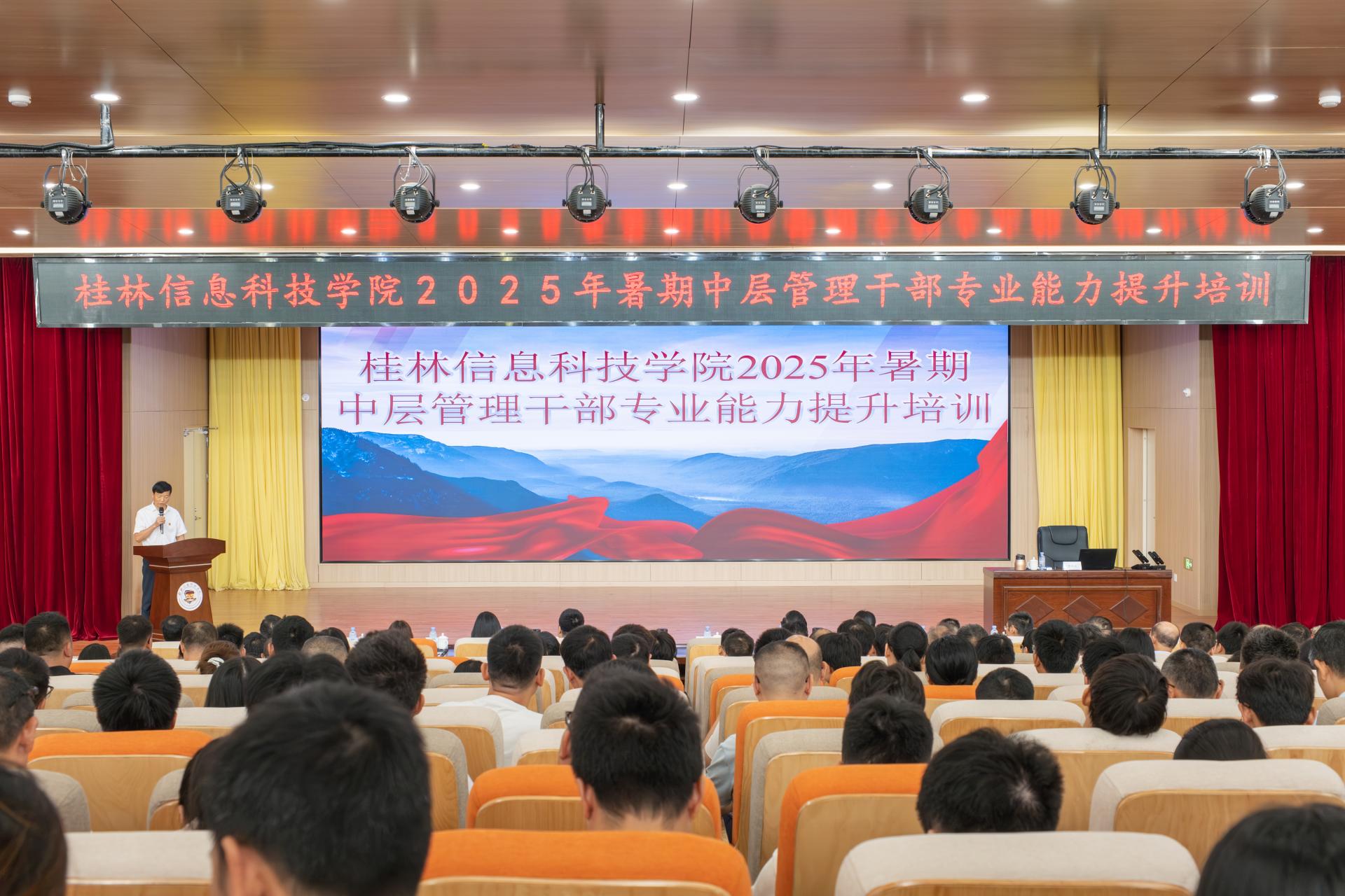 为全面贯彻党的二十大精神及教育部关于高等教育现代化的战略部署,切实提升中层管理干部的业务素养与专业能力,7 月 28 日上午,学校举办了 2025 年暑期中层干部专业能力提升培训班。本次培训班特别邀请到广西师范大学党委书记、广西运河研究院院长、桂林发展研究院院长贺祖斌教授,作题为《培训班围绕新建本科院校教学工作合格评估 —— 兼论独立学院转设后高质量发展》的专题报告。学校董事长罗欣、全体校领导、全校中层干部、院长助理、教研室正副主任及各单位教师代表参加了报告会。报告会由校长解庆林主持。