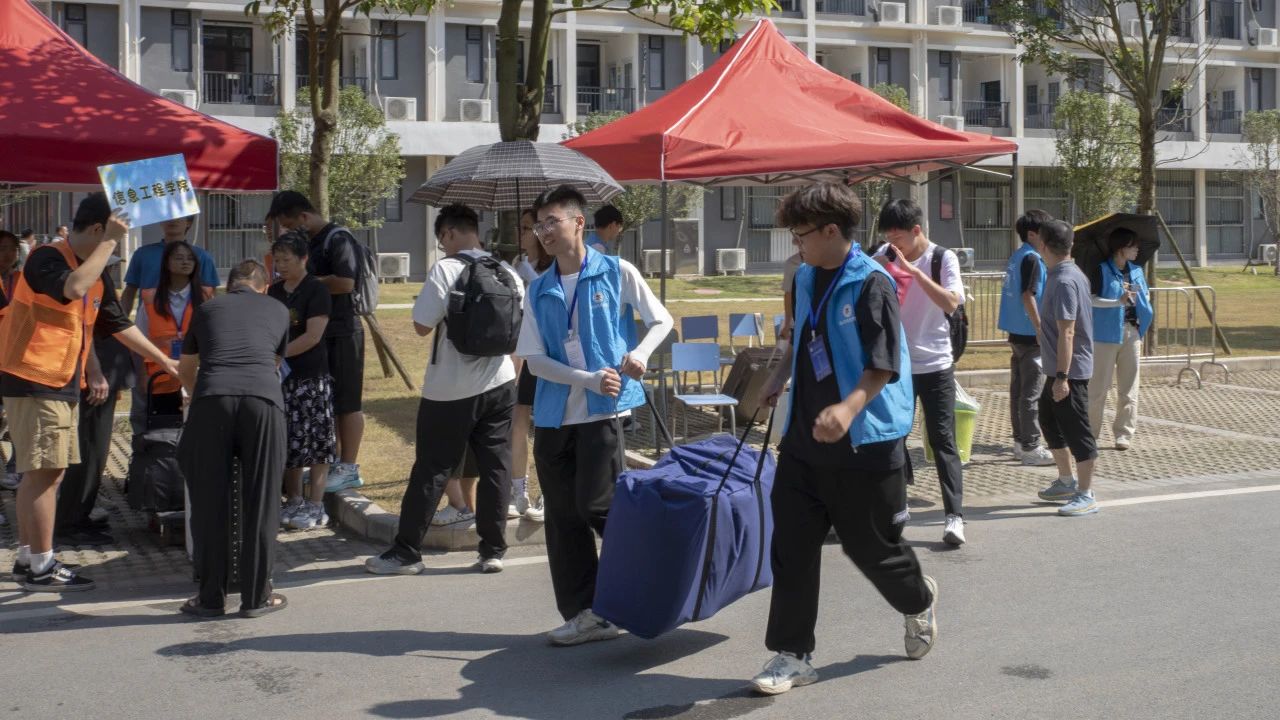 身穿蓝马甲的学生志愿者,穿梭在校门口与宿舍间,接过沉重行李,也接住了新生初到时的忐忑与陌生。