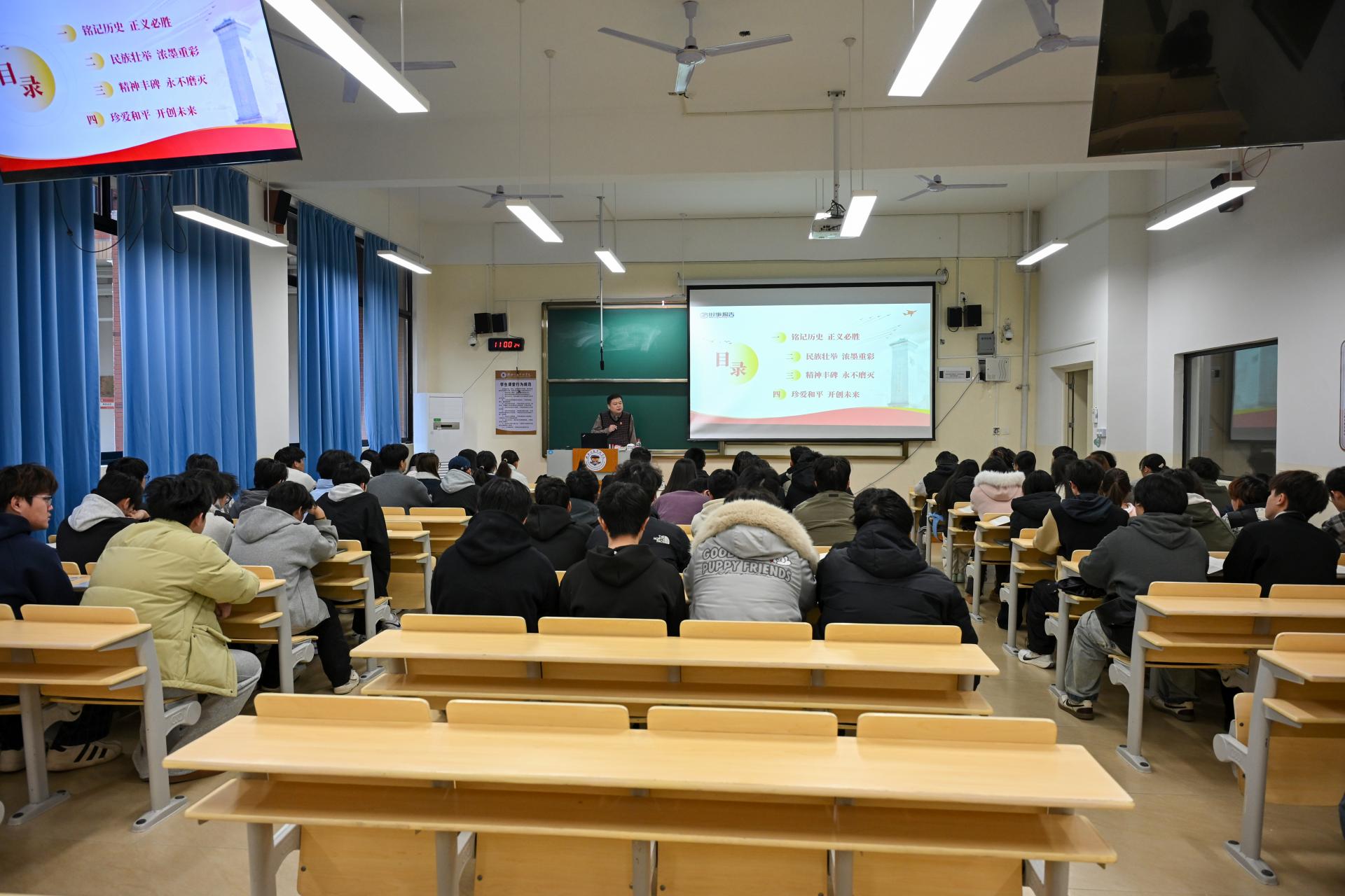 学校纪委书记、校长助理周璇以“纪念抗战胜利,坚定民族信念”为主题,从四个核心维度展开:一是“铭记历史 正义必胜”,二是“民族壮举 浓墨重彩”,三是“精神丰碑 永不磨灭”,四是“珍爱和平 开创未来”。他通过翔实的历史资料和生动的案例,为信息工程学院大一学生深入阐释了抗战精神的时代价值。他勉励同学们要从中汲取磅礴的精神力量,将其转化为刻苦学习、增长才干、服务国家、奉献社会的实际行动。