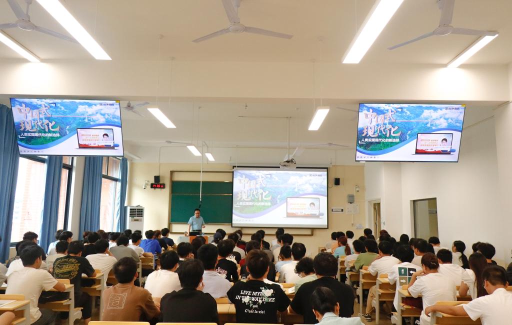 甘书记授课的专题是“读懂中国式现代化”。甘书记开篇以“什么是中国式现代化”问题导入引导学生认真思考,在与学生的交流互动中引导学生厘清了中国式现代化的深刻内涵和鲜明特点。从国际和国内的形势,带领学生们了解了当前我国推进中国式现代化所面临的机遇与挑战。并结合国家重大政策列举了党和国家在推进中国式现代化建设方面的具体举措。
