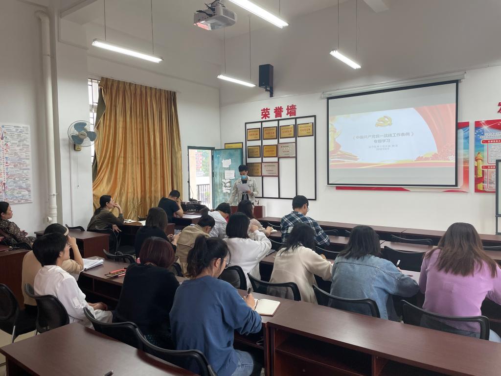 4月29日,商学院教工党支部在11501党员活动室组织学习《中国共产党统一战线工作条例》,本活动由教工党支部副书记陈龙同志主持,全体教师参与了本次学习。