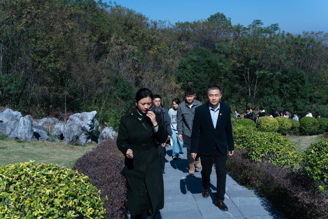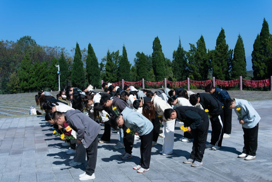 馆内参观结束后,全体人员前往纪念林凭吊广场举行庄重缅怀仪式。“一山一石一忠魂,一草一木一丰碑”。大家整队肃立、集体默哀并三鞠躬,随后依次敬献黄色菊花并绕行纪念碑一周,深切缅怀革命先烈。