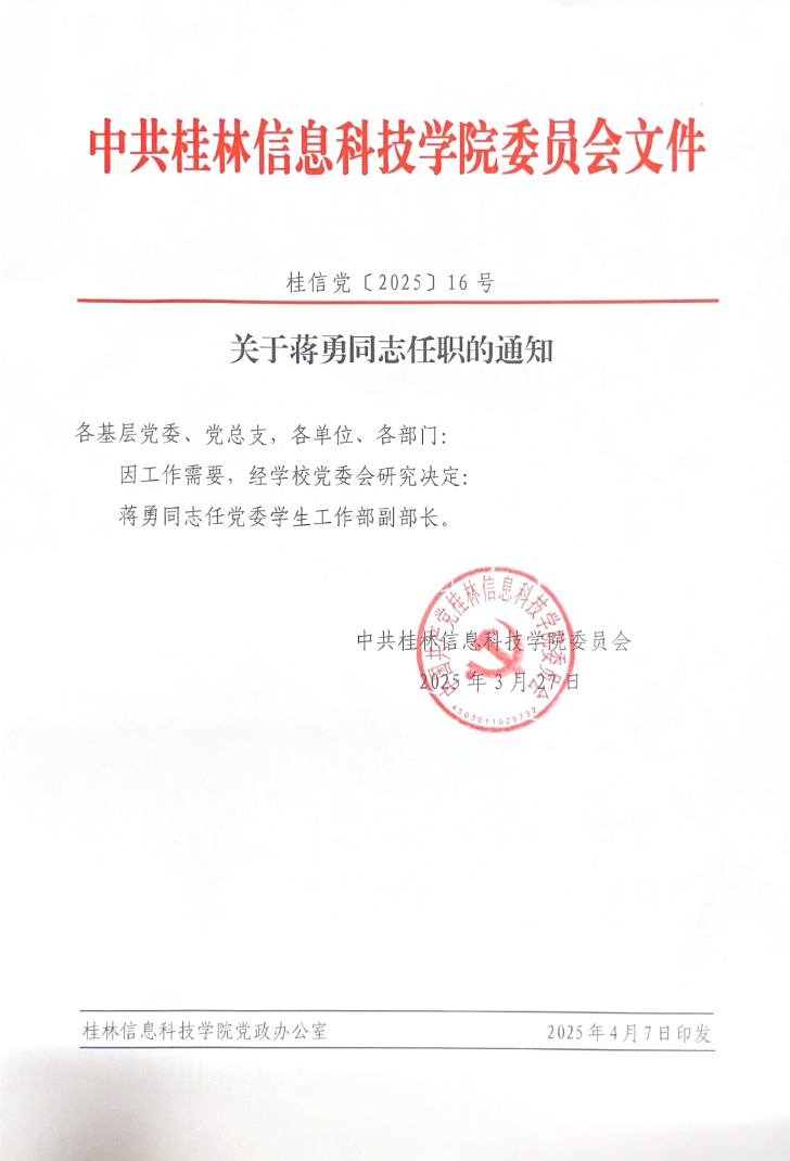 关于蒋勇同志任职的通知