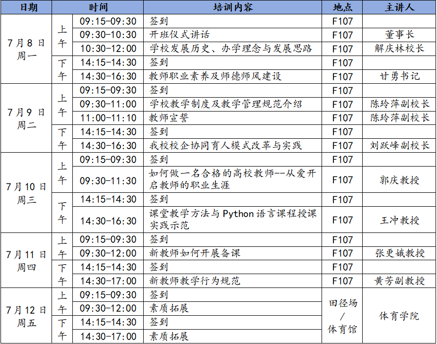 培训采取自主学习、集中培训与素质拓展等方式。自主学习以人事处汇编的学校相关管理制度为基础开展个人学习;集中培训主要包括校史校情、教师职业素养及师德师风、教学管理制度、校企合作教学模式及教师职业成长路径等内容;素质拓展以开展团队游戏形式为主。详细请见培训安排。