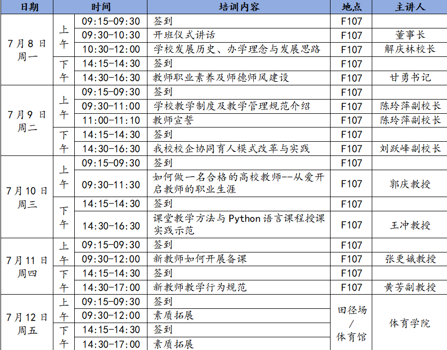 培训采取自主学习、集中培训与素质拓展等方式。自主学习以人事处汇编的学校相关管理制度为基础开展个人学习;集中培训主要包括校史校情、教师职业素养及师德师风、教学管理制度、校企合作教学模式及教师职业成长路径等内容;素质拓展以开展团队游戏形式为主。详细请见培训安排。