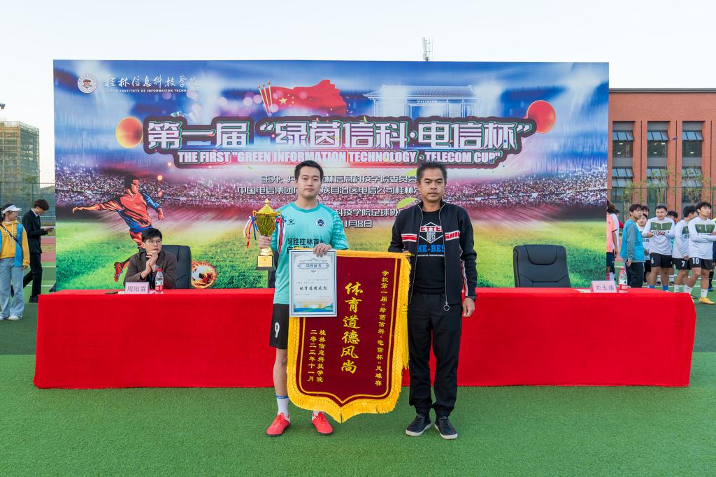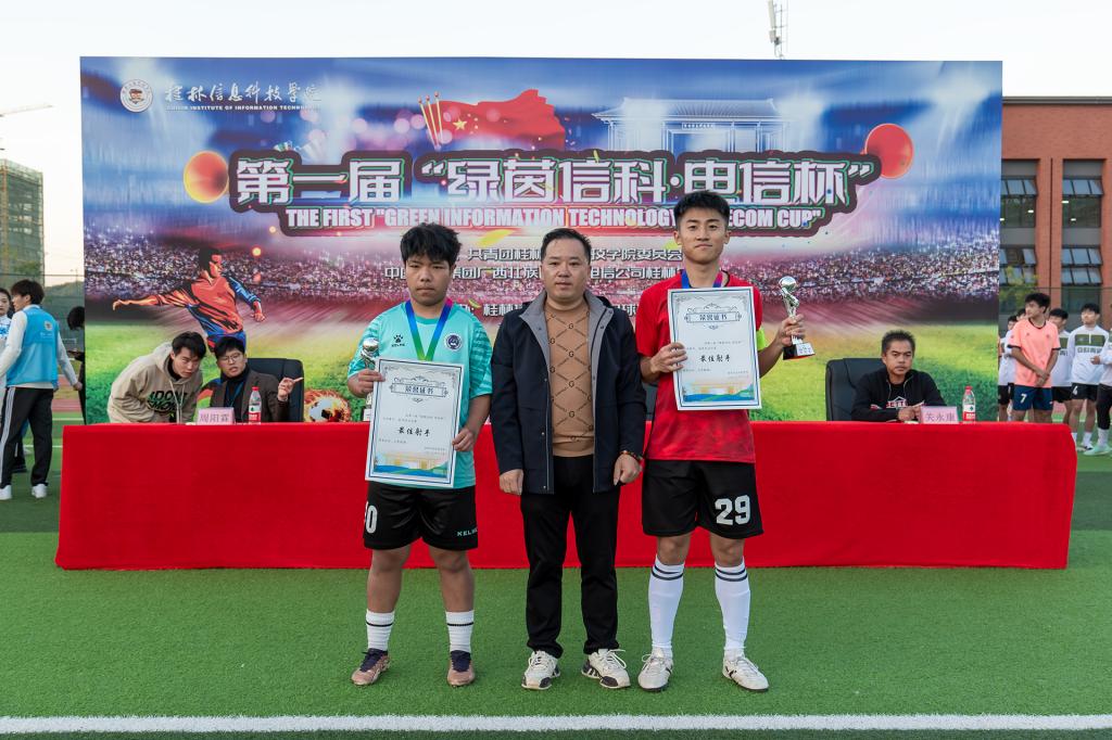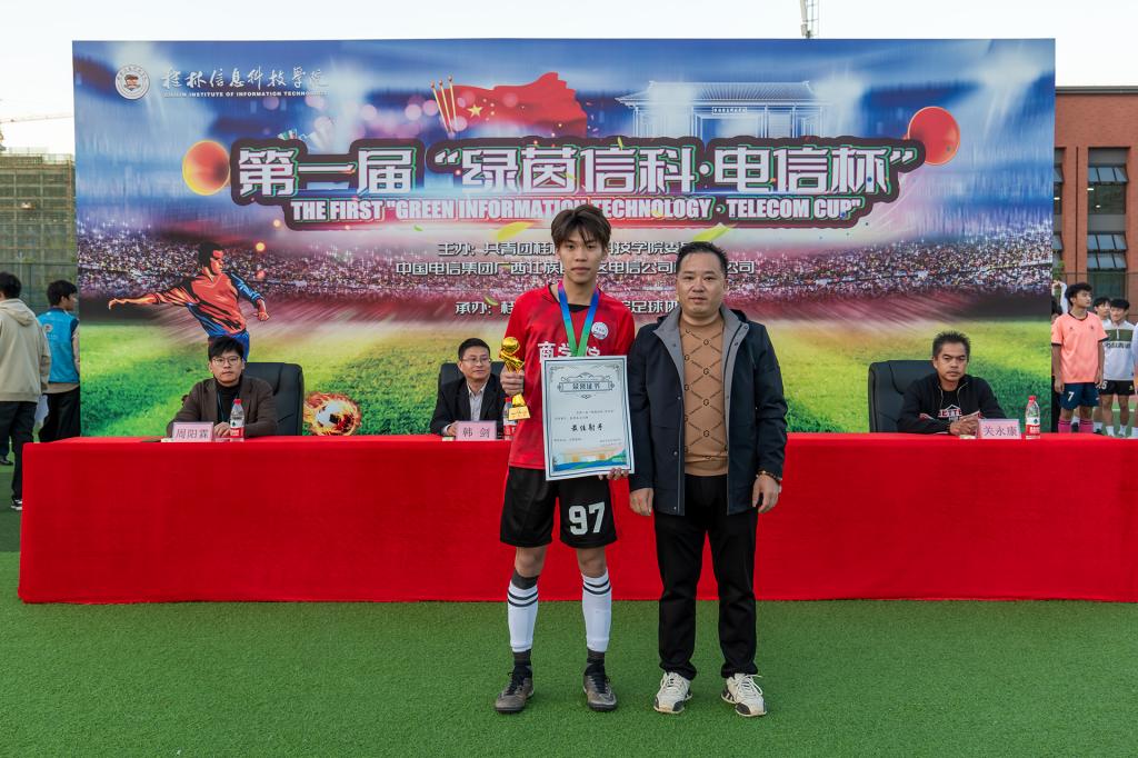 在比赛现场,学校校长助理韩剑和本次比赛独家赞助商桂林市湘婷通讯有限公司总经理覃军来到现场观赛,共同见证了这场足球盛宴。比赛结束后,举行了隆重的颁奖仪式,本次比赛设立了金靴、银靴及金手套奖等个人奖项,以表彰在赛场上表现突出的运动员。金靴奖得主是来自商学院一队的优秀前锋朱冠璋,在本次比赛中他以攻入28球的总进球数“傲绝群雄”,成为最佳射手;银靴奖则由商学院的黄奕森和外贸与外语学院的翟煜博共同获得。金手套奖颁给了商学院一队的主力门将童康铭,他在比赛中多次化解对方极具威胁的进攻,成为球队夺冠的关键人物。