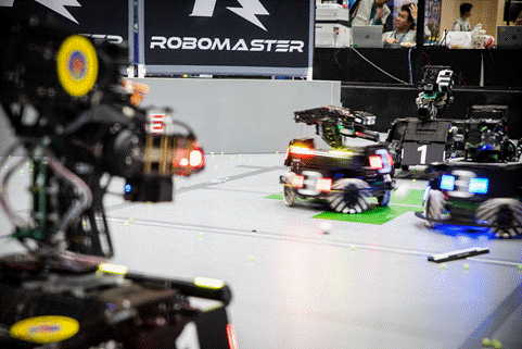 学校融媒体中心团队联合机甲大师赛务呈现组,通过网络NDI信号读取裁判系统实时数据,基于Unity引擎制作的赛事UI图像结合AR基础组件AR Foundation提供的AR效果,将赛事数据以图形UI形式投射到赛场画面之上,实现类大型体育赛事的画面效果。