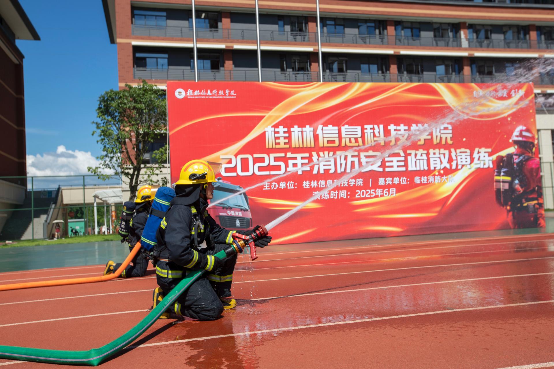 第三阶段,结合学校实际情况开展消防安全疏散演练活动。保卫处、学生发展与服务中心、后勤服务处联合临桂三元消防救援站针对学校公寓安全负责人、新入职教职员工、学生开展消防安全疏散演练,加强应急疏散知识与技能,学习灭火器、消防水带的使用技能,进一步提升师生员工的应急处置能力。