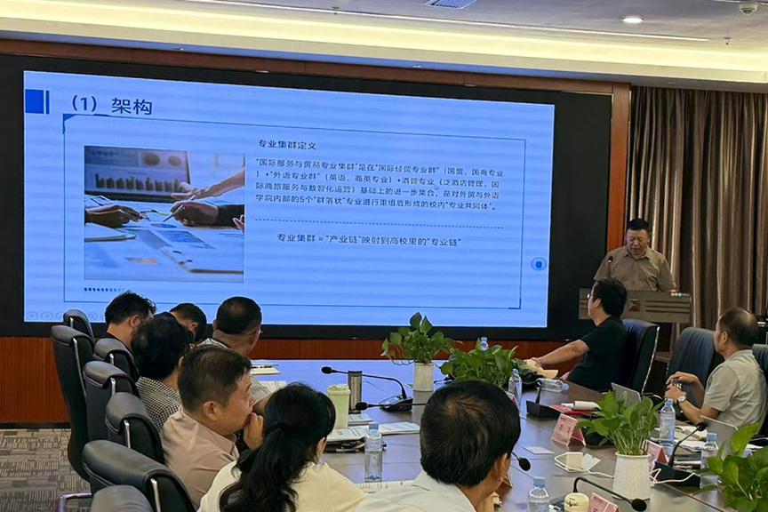 外贸与外语学院院长王家年汇报“国际服务与贸易专业集群”,整合国际商务等5个专业构建“外语+外贸+数智”生态,3年内拟建设RCEP数字贸易微专业,实现与东盟高校学分互认。