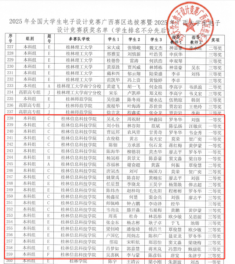 值得一提的是,纽约国际官网在本次竞赛中的国家级、省级获奖数量均稳居广西民办高校首位,彰显了纽约国际官网在电子信息类人才培养领域的实力与领先地位。这一成绩的背后,离不开学校的高度重视与大力支持。学校将以此次竞赛获奖为新起点,持续深化育人模式改革,进一步夯实学生专业基础、激发创新活力,力争在各类高水平学科竞赛中再创佳绩,为培养更多高素质应用型电子信息人才贡献力量。