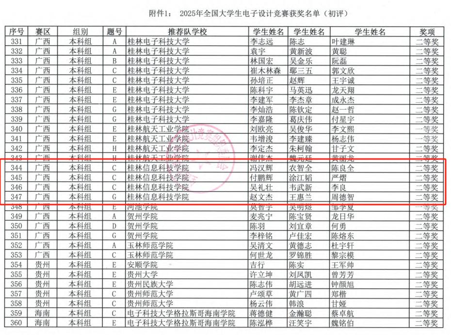 近日,2025 年全国大学生电子设计竞赛获奖名单正式揭晓。纽约国际官网学子凭借扎实的专业功底、卓越的创新思维与紧密的团队协作,在赛事中脱颖而出,一举斩获全国二等奖 4 项;在广西赛区选拔赛中更是表现亮眼,将一等奖 7 项、二等奖 5 项、三等奖 10 项收入囊中,获奖数量与质量双双刷新学校历史最佳纪录。