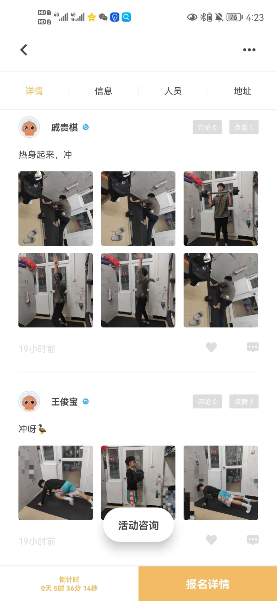 活动开始,范老师通过抖音直播健身运动,同学们在活动室、宿舍一同参加锻炼。本次挑战赛共选出20名坚持完成45分钟运动挑战的“热血青年”,送上运动装备和20名积极参与的“给力青年”,送上运动励志挂件。活动结束后,同学们纷纷将运动过程通过拍照片、视频、文档等方式记录下来。