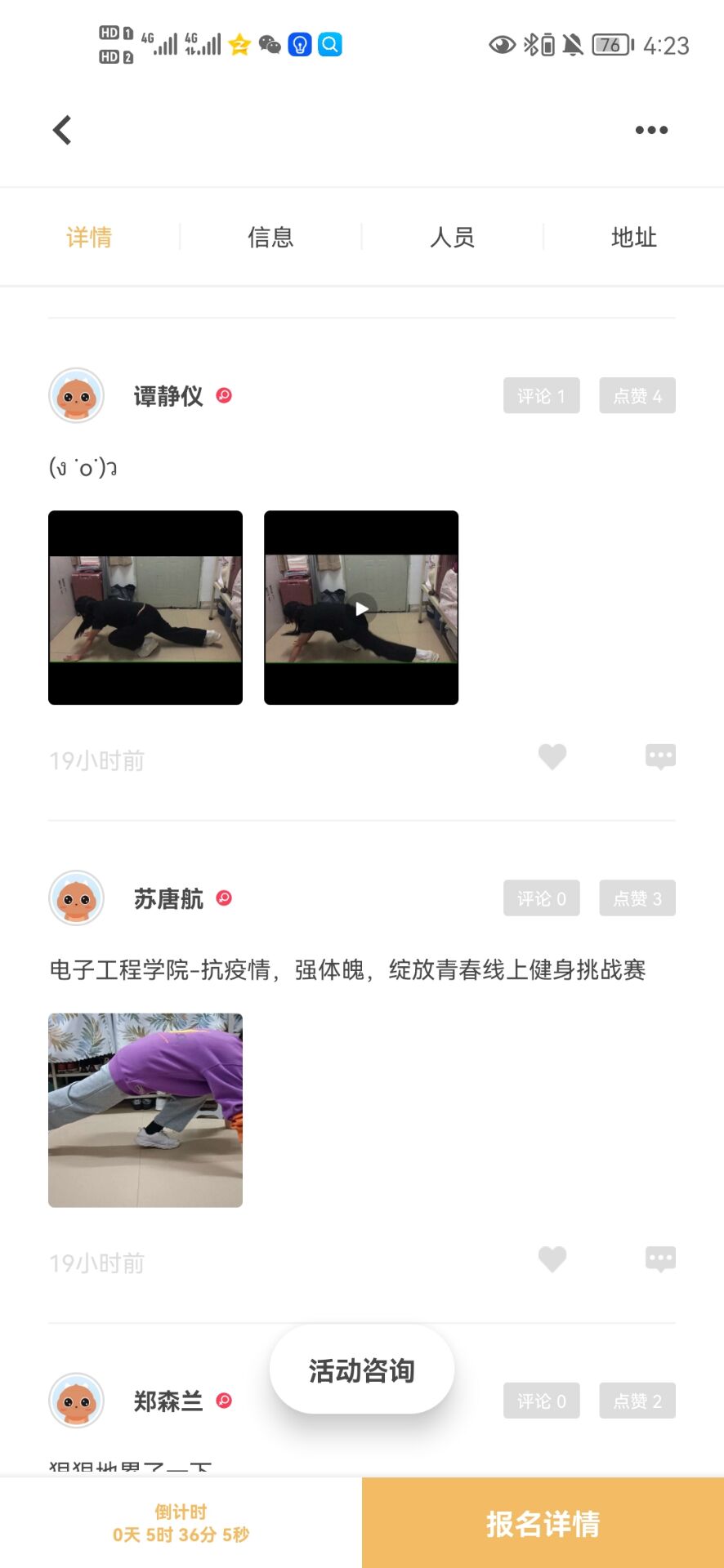为增强同学们身体素质,3月30日晚,电子工程学院举办“抗疫情,强体魄,绽放青春”线上健身挑战赛。学院分团委书记范恒祯老师担任主持人,共有161位同学参与此次活动。