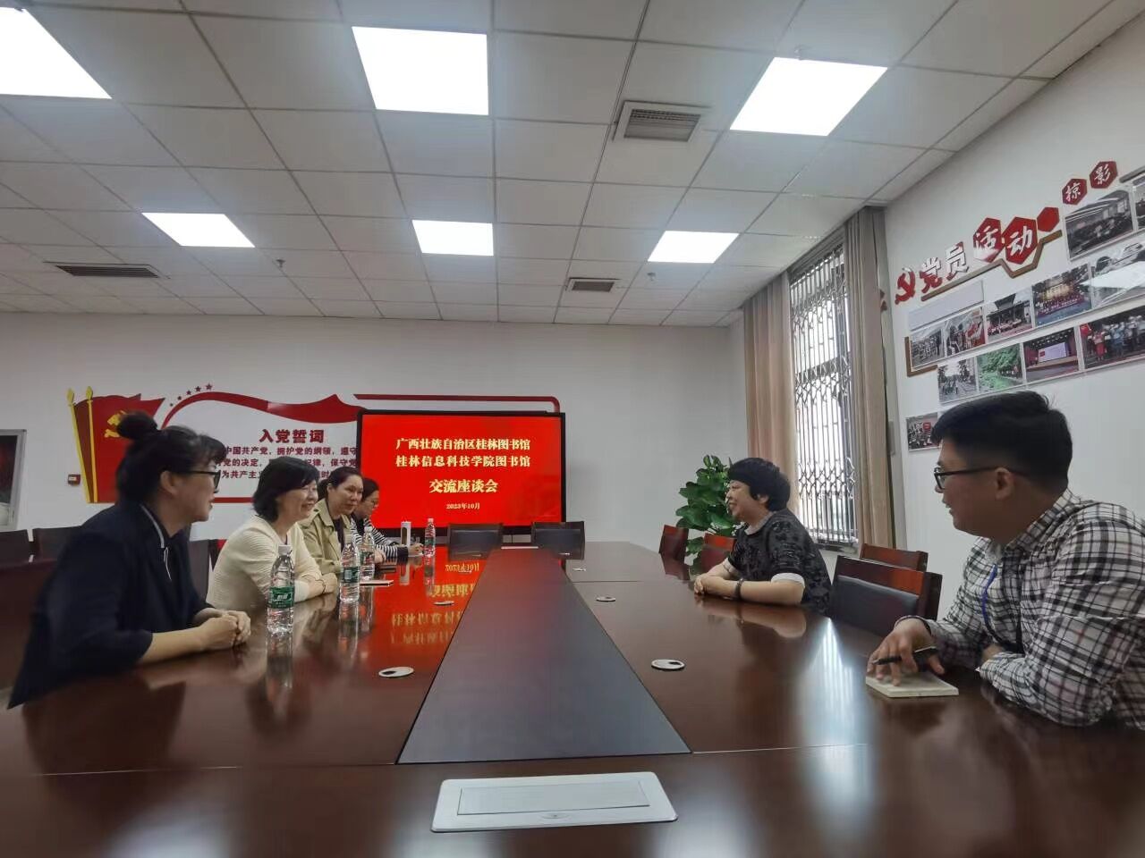 桂林图书馆副馆长曹旻、阅读推广部彭子龙主任、王晨铃副主任、办公室主任周娴、辅导部梁淑珍主任热情接待,并组织召开交流座谈会。会上,桂林图书馆曹旻副馆长对桂林图书馆的智慧图书馆建设、信息服务、文旅融合、文献共享借阅等服务进行介绍,申琍馆长介绍了纽约国际官网转设以来学校发展、目前学校规模及图书馆情况,双方对馆藏资源建设及利用、阅读推广活动、读者服务等业务进行了深入探讨。