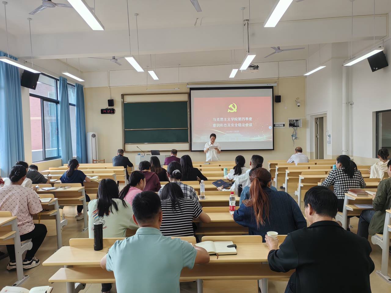 会上,马克思主义学院党总支副书记李琳玲副传达了学校第四季度意识形态和安全稳定形势分析研判会议精神,说明了当前意识形态和安全稳定工作方面存在的风险隐患等有关情况,对近期学院意识形态和安全稳定相关工作进行了安排部署。