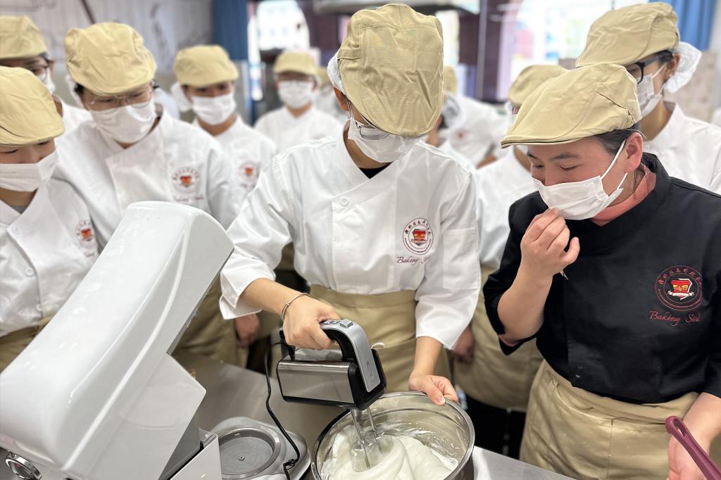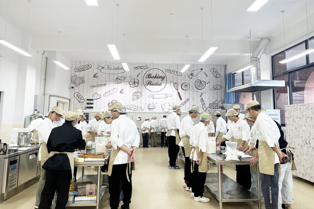 本次课程由梁老师通过现场实操,配合理论知识讲解,教授学生制作酥皮蛋挞、牛奶草莓布丁、牛奶曲奇、海盐爆浆、巴斯克芝士、巧克力蛋糕卷等西式糕点,指导学生掌握食品搅拌机的操作技巧、合理选用和调配食材、正确设置不同西点的烤箱温度与时长等,并要求学生严格遵守食品安全规定,课后准确计算食品制作成本,培养学生产品成本管控的意识与能力。