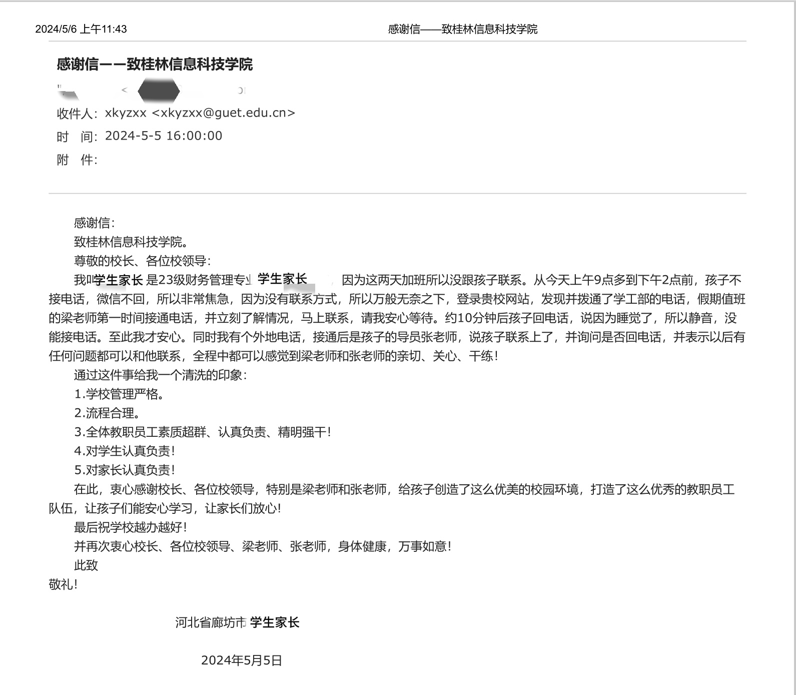 5月6日,一封充满感激与敬意的感谢信被投递至校长信箱,这是一位学生家长对学校及全体教职员工的诚挚致谢。