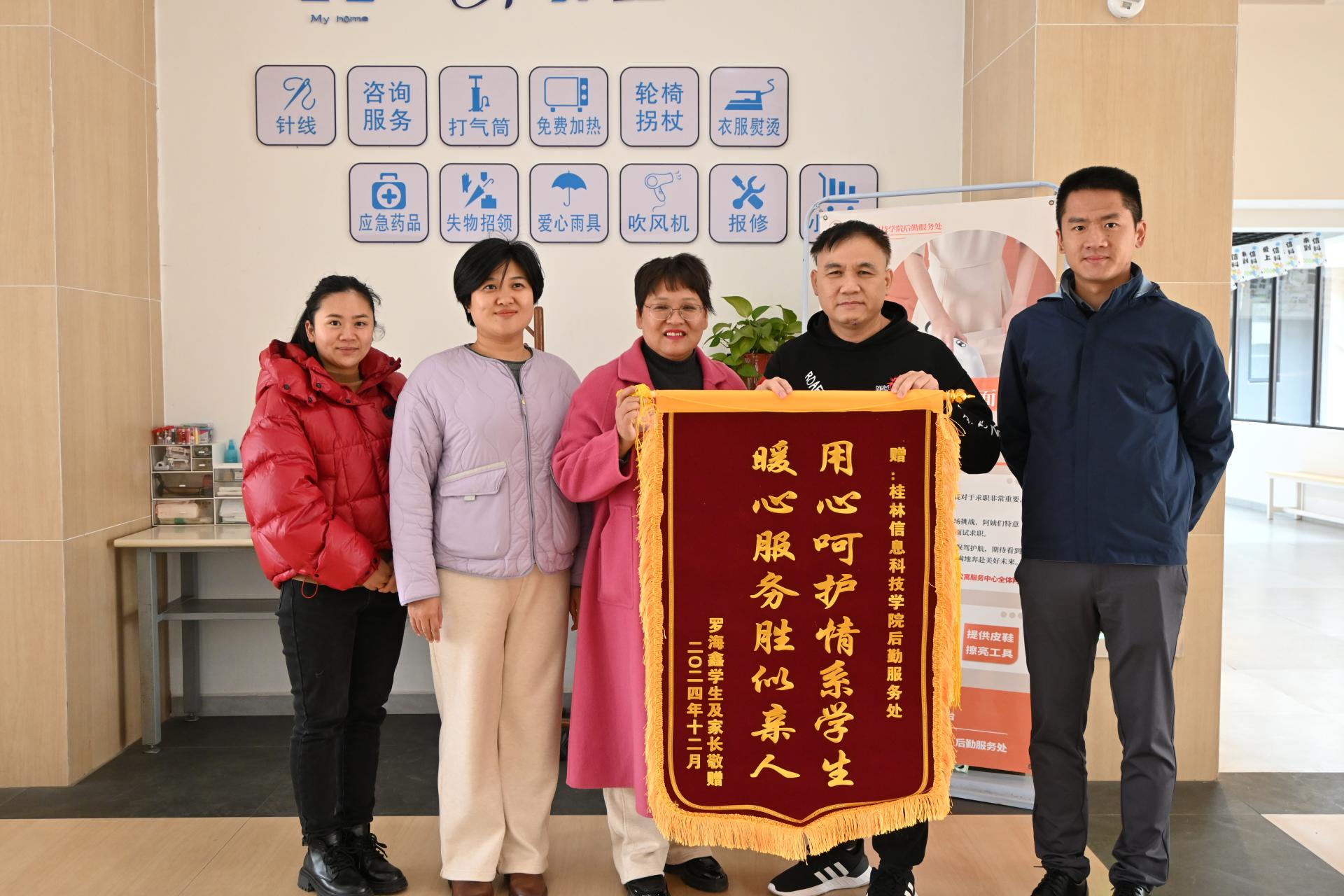 12月27日下午,后勤服务处收到了一面由学生及家长赠送的写有“用心呵护情系学生,暖心服务胜似亲人”的锦旗,表达了对后勤工作人员的深切感激。