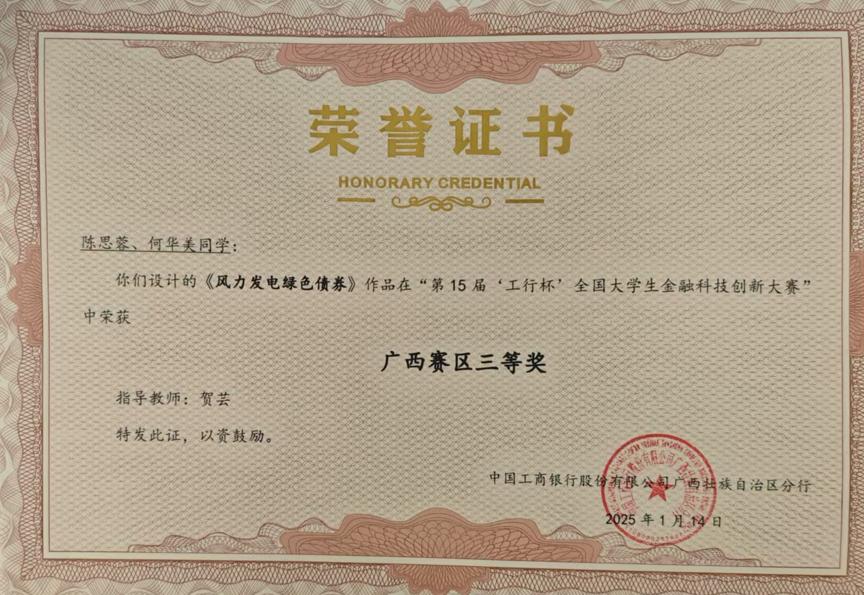 据悉,本次大赛共吸引来自广西区内21所高等院校的1407名同学报名参赛,商学院师生共组建56支队伍100余人次参加本次大赛。学院高度重视此项赛事,紧扣当前金融热点,响应国家政策导向,审慎确定参赛作品选题。师生齐心协力,反复打磨,力求以最优质的方案参赛。最终,陈思蓉、何华美同学的作品《风力发电绿色债券》、翟艳茹、雷美玲同学的作品《萌宠优享家》、伍宇轩、王静连同学的作品《工银碳融》及向康、谢徐卫同学的农产品综合平台《仝铲铲》凭借其优异表现,最终获得广西赛区三等奖的成绩。