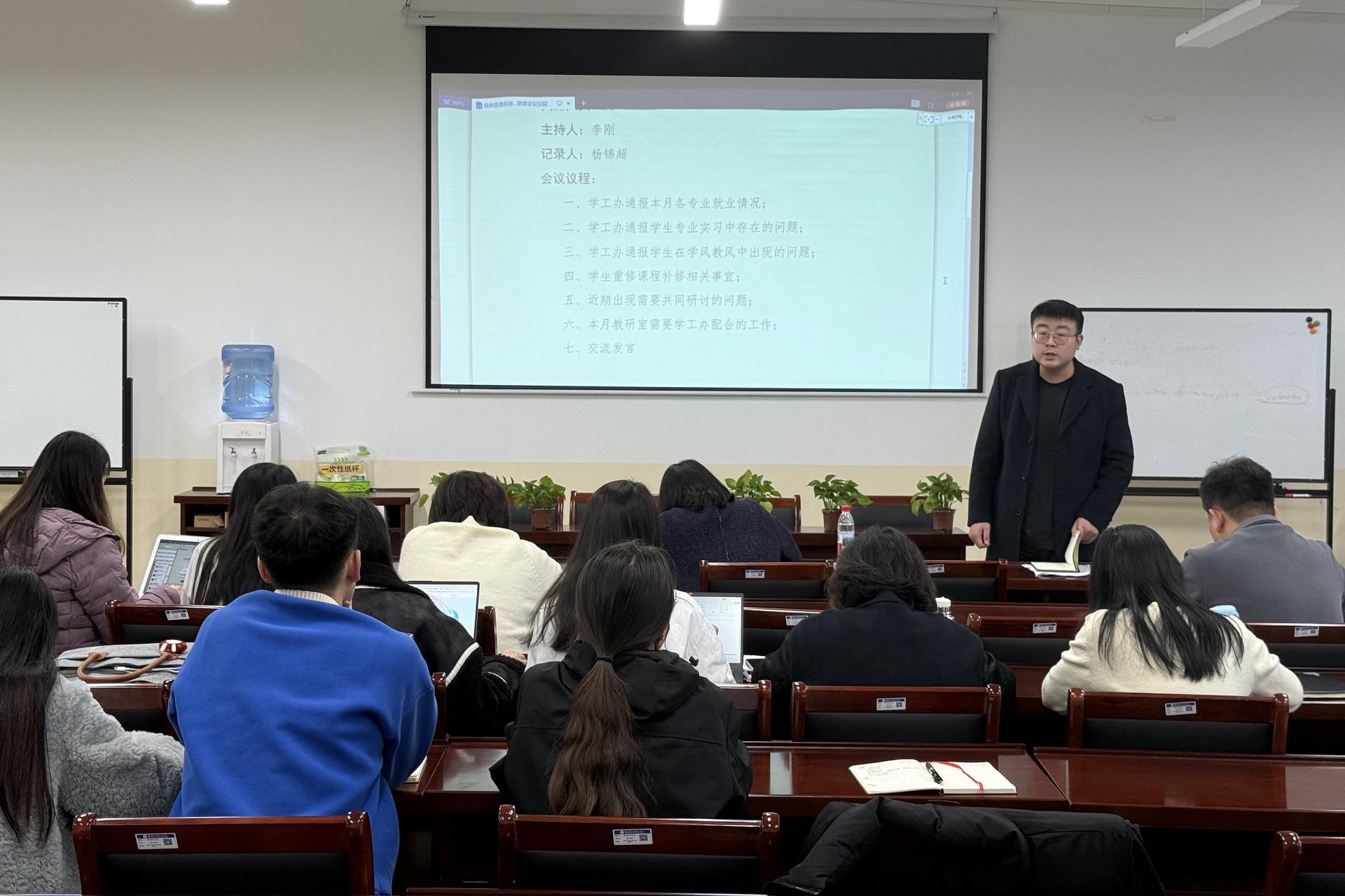 会议聚焦“学生就业质量提升工程”与“学风建设深化行动”两大主题,系统梳理了2025届毕业生就业动态、实习管理规范、教学反馈机制等六大关键领域。学工办杨锦超老师作专题汇报,通过数据分析揭示了当前就业市场对接、实习材料审核标准执行、学业指导资源配置等方面存在的提升空间。与会人员针对重点问题展开专项研讨,最终形成“就业-实习联动推进方案”“学业预警动态管理机制”等五项具体举措。