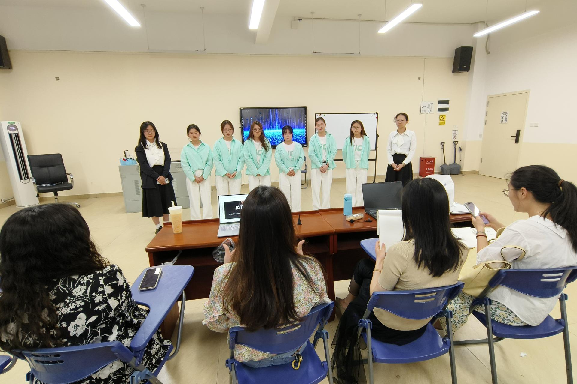 培训分为产品发布会演练与模拟商务谈判两大环节。两支参赛队伍首先进行全英文产品发布展示,指导教师从市场定位、核心卖点提炼到视觉呈现效果进行了系统点评。李靖航老师着重强调"差异化展示策略",指出发布会要突出产品核心亮点,结合市场趋势,打造出极具吸引力的发布内容;闵世琦老师则针对PPT的设计排版、演讲者的肢体语言与表达技巧等给出了细致建议。