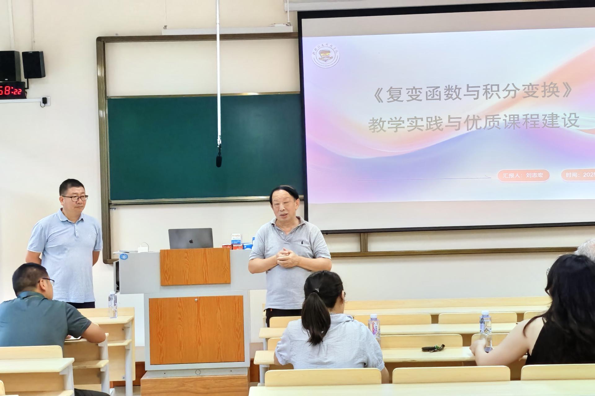 报告中,刘志宏副教授从《复变函数与积分变换》的课程概述、存在问题与解决策略、教学过程设计、评价反馈机制、教学效果与展望和打造智慧型课程等六个方面,系统介绍了自己在教学实践中的探索和优质课程建设方面的经验与思考。他重点分享了如何将实际问题融入理论教学、借助信息技术辅助抽象概念讲解、复变函数可视化,以及如何通过多元考核方式激发学生学习主动性等具体做法,为在座教师提供了丰富的可借鉴案例。在提问环节中,参会教师围绕课程难点处理、教学资源整合、学生学习动力提升等问题与刘志宏副教授进行了深入的交流。