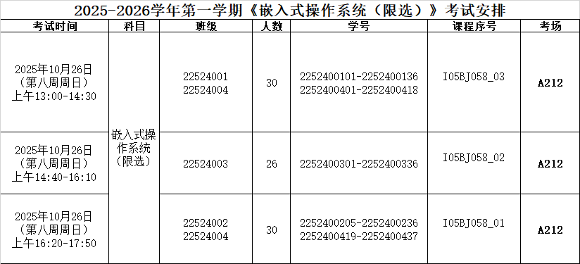 2025-2026学年第一学期《嵌入式操作系统(限选)》考试安排如下: