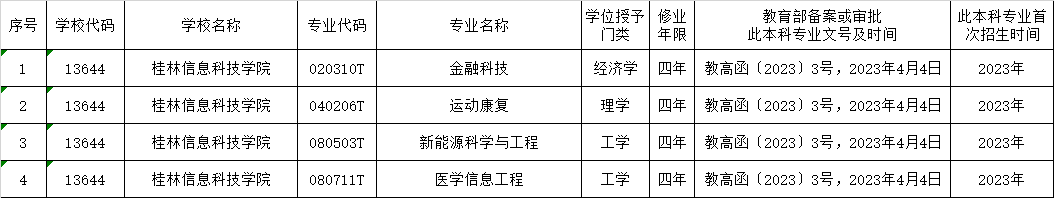 根据国务院学位委员会《学士学位授权与授予管理办法》(学位〔2019〕20号)和自治区学位委员会、自治区教育厅《广西壮族自治区学士学位授权与授予管理办法》(桂教规范〔2022〕7号)以及《广西壮族自治区学士学位授权审核标准》要求,经各二级学院组织专家论证及申报,教务科技处审核,学校学位评定委员会审议,同意新增金融科技(020310T)、运动康复(040206T)、新能源科学与工程(080503T)、医学信息工程(080711T)4个专业为学士学位授权专业。