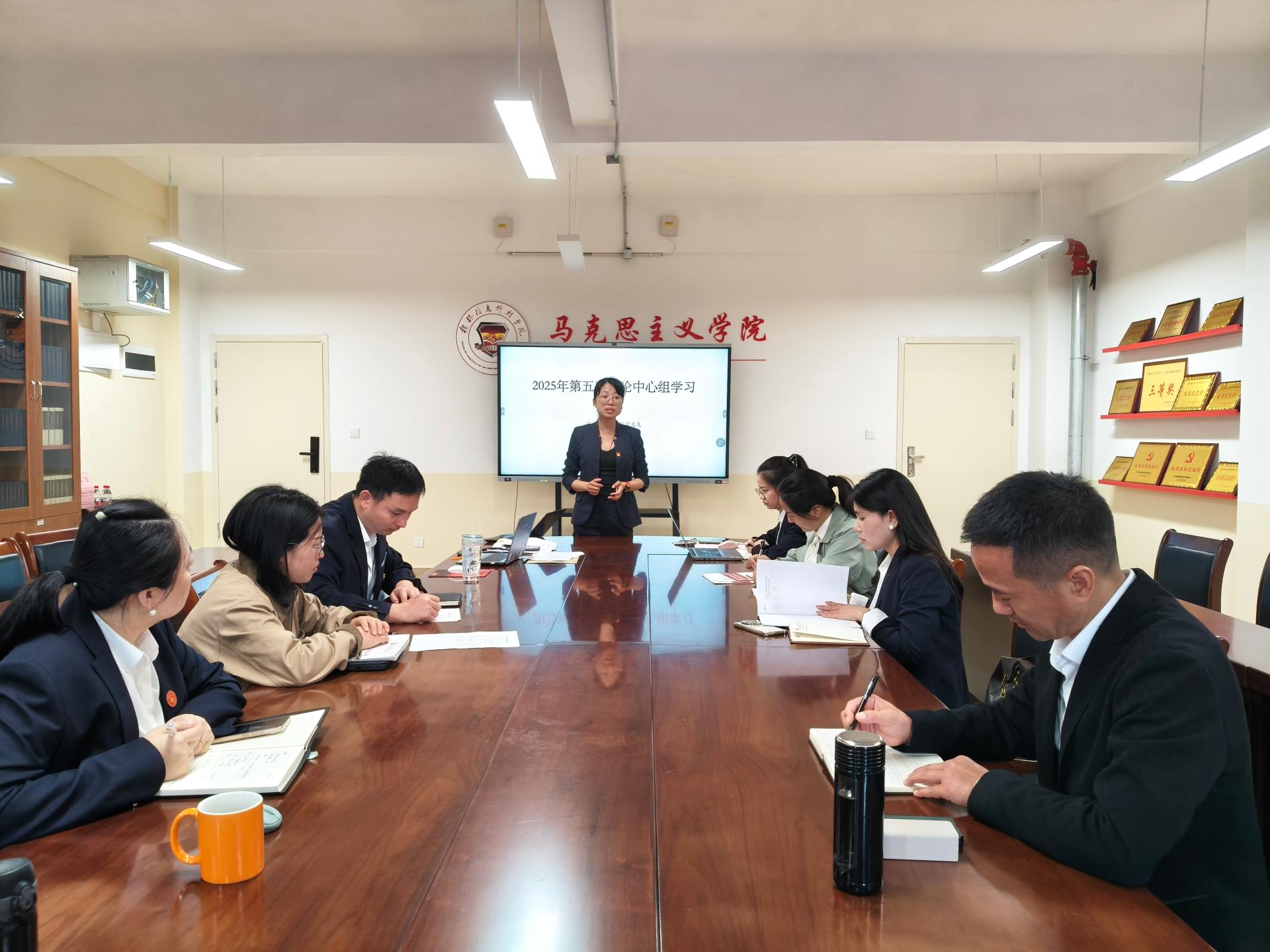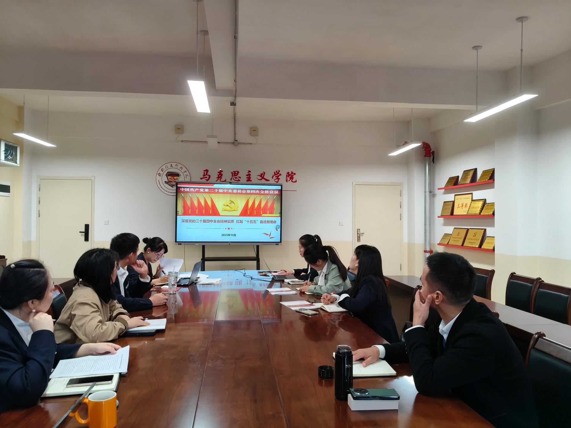 10月31日下午,马克思主义学院党总支理论学习中心组在G610会议室召开2025年第五次集中学习(扩大)会议,会议由党总支书记赵奕主持,党总支理论学习中心组成员、各党支部书记及组织员参加会议。