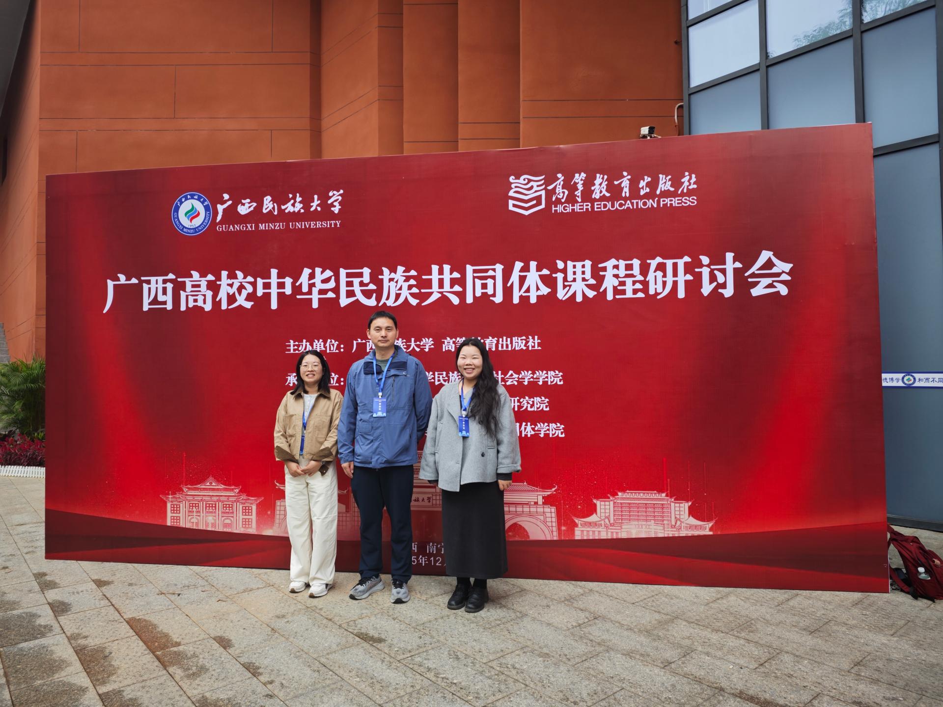 为进一步推动中华民族共同体意识教育深度融入高校思政课程体系,切实提升教学质量和育人成效,12月13日,马克思主义学院副院长赖学良率骨干教师蒋春妹、荣雪辰赴南宁参加广西高校《中华民族共同体概论》课程研讨会。